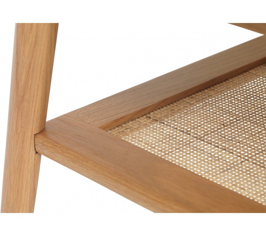Stolek je vyroben z kombinace masivního a dýhovaného dubového dřeva, které mu propůjčuje svoji charakteristickou světlou hnědou barvu s pravidelnou kresbou letokruhů. Jeho vizuál je typický pro skandinávský styl a přinese do prostoru výrazný přírodní prvek. Skvěle jej doplňuje jednoduchý ratanový výplet se čtvercovým vzorem ve světlé béžové barvě, který dodává nábytku retro nádech.