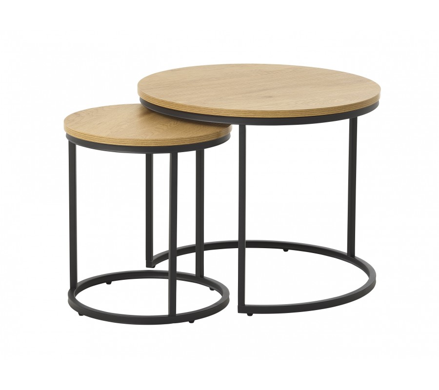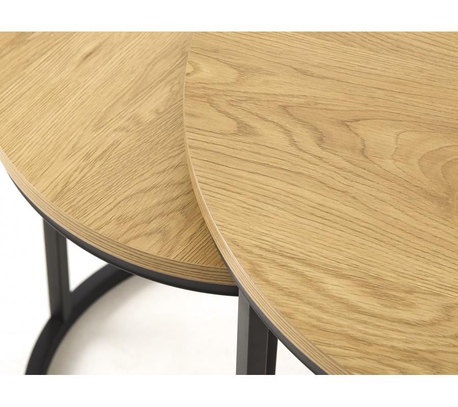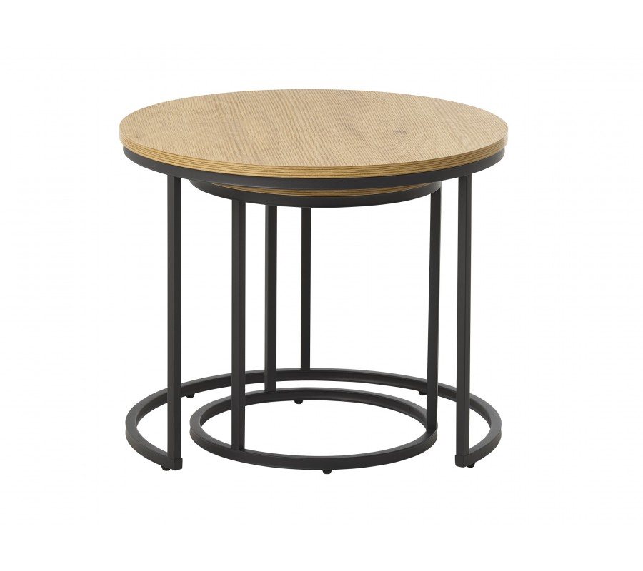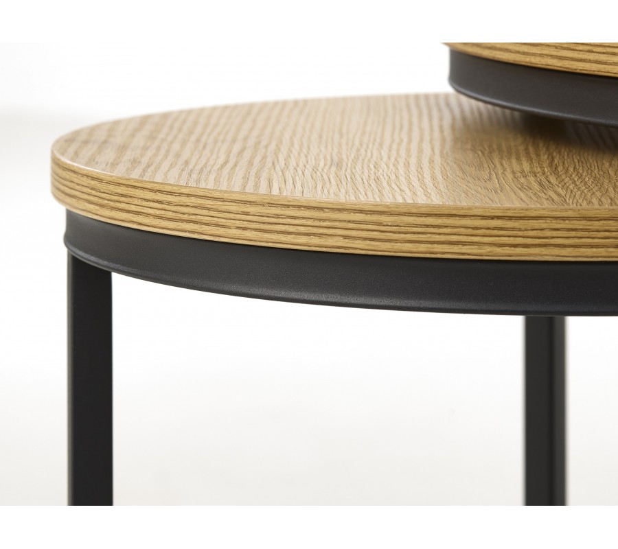 Kovová konstrukce v matné černé barvě dodává sadě charakteristický industriální vzhled. Tenké linie podstavy s hranatým profilem působí elegantně a vzdušně. Vrchní desky jsou vyrobeny z dýhy s melaminovou úpravou, která zvyšuje jejich odolnost vůči teplu, vlhkosti i běžnému opotřebení. Světlý dubový dekor zároveň vytváří pocit tepla a kontrast k tmavé podnoži.