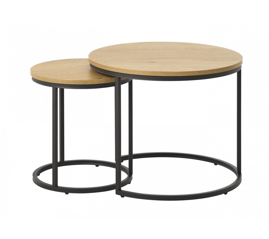 Moderní sada kulatých konferenčních stolků Holstebro se světlými hnědými dubovými deskami a černou podstavou 50 cm