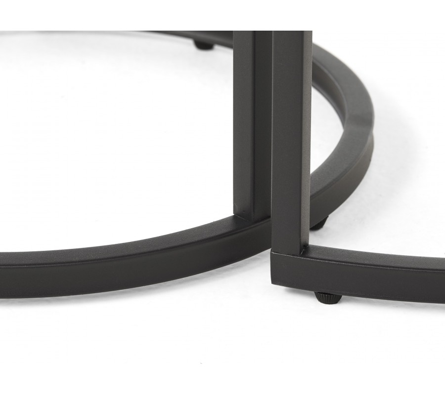 Sada obsahuje dva kulaté stolky různých velikostí. Menší stolek má výšku 45 cm a průměr 40 cm, zatímco větší dosahuje výšky 50 cm a průměr 60 cm. Desky jsou osazeny na kovové konstrukci se třemi štíhlýma nohama, které jsou propojeny spodní kulatou výztuhou pro lepší stabilitu. U většího kusu je třetina podstavy vynechána a umožňuje tak pod něj zasunout menší kus.