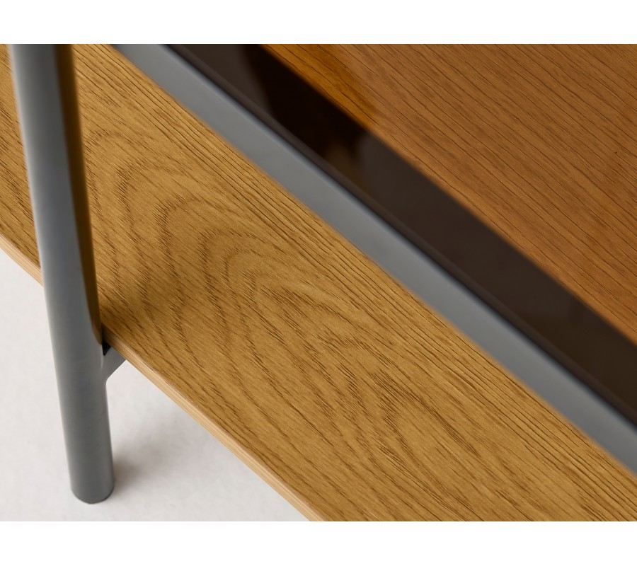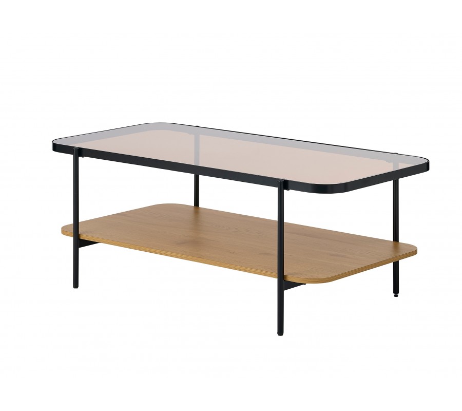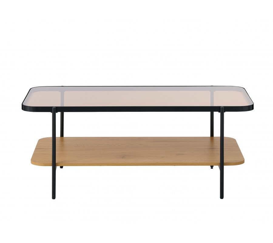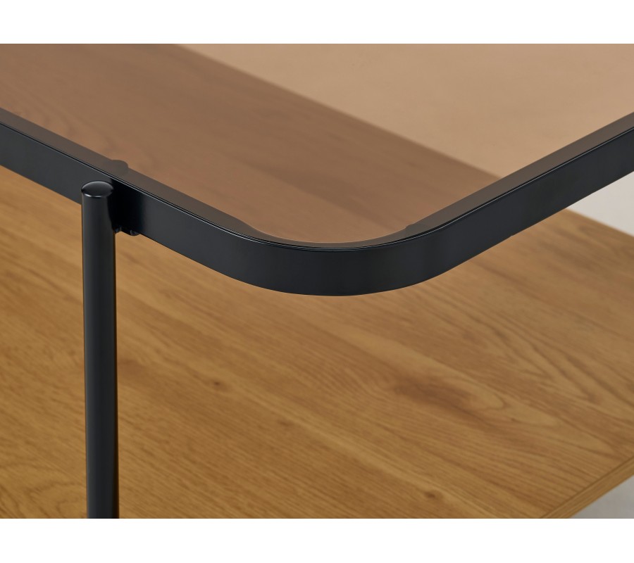 Stolek má obdélníkovou vrchní desku, vyrobenou z bezpečnostního skla, které zaručuje pevný a na údržbu nenáročný povrch. Je průhledná a tónovaná do hnědé barvy. Ve spodní části ji doplňuje police stejného tvaru z melaminové dýhy ve světlém hnědém dubovém provedení, které krásně ladí s barvou skla a dodává nábytku teplý přírodní prvek. Melaminová vrstva zároveň poskytuje ochranu proti horku, oděru a vlhkosti.