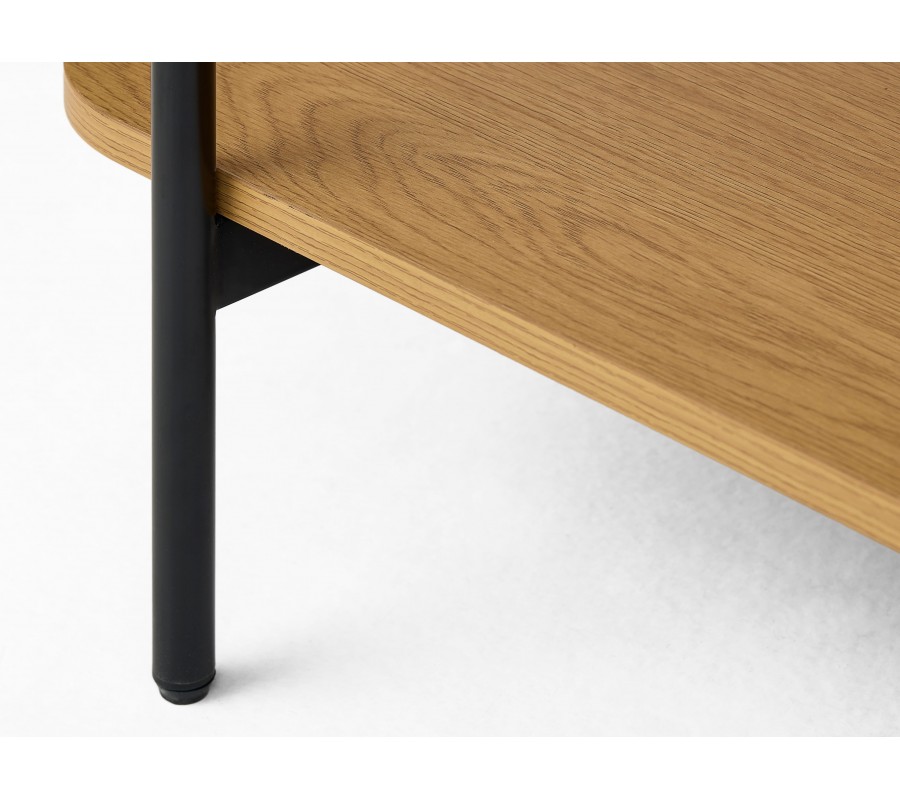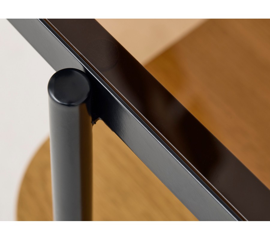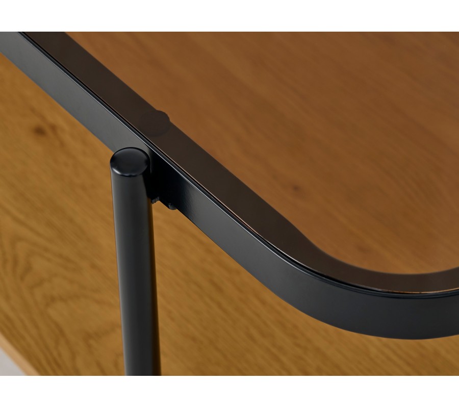 Zaoblené rohy zjemňují jinaklineární siluetu a dodávají stolku retro výraz. Vrchní deska je osazena v kovovém rámu, ke kterému jsou na delších stranách upevněny čtyři nožičky, držící zároveň i polici. Jejich štíhlý válcovitý tvar působí v kombinaci se sklem odlehčeně a vzdušně. Provedení v černé barvě zase vytváří stylový kontrastní prvek.