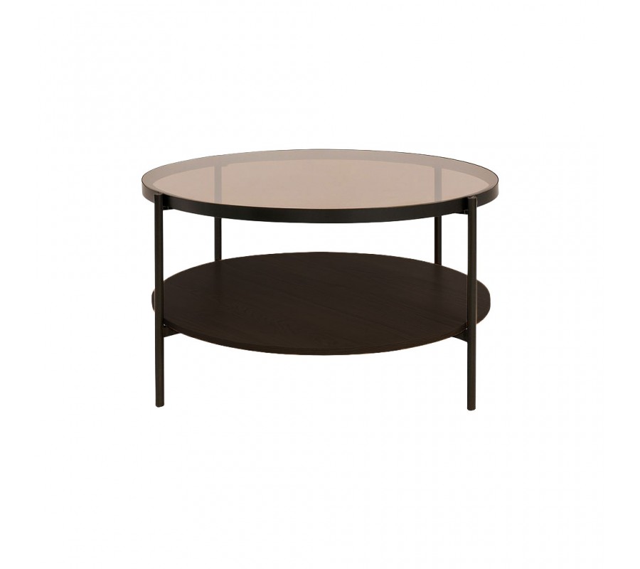 Stolek má kulatou vrchní desku z hnědého tónovaného temperovaného skla. Doplňuje ji police stejného tvaru z melaminové dýhy v tmavém hnědém dubovém provedení s pravidelnou kresbou letokruhů, která dodává stolku teplý přírodní prvek. Bezpečnostní sklo poskytuje pevný, pro údržbu nenáročný povrch a melamin je zase mimořádně odolný vůči otěru, teplu a vlhkosti.