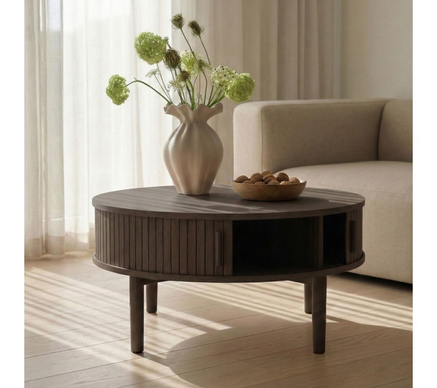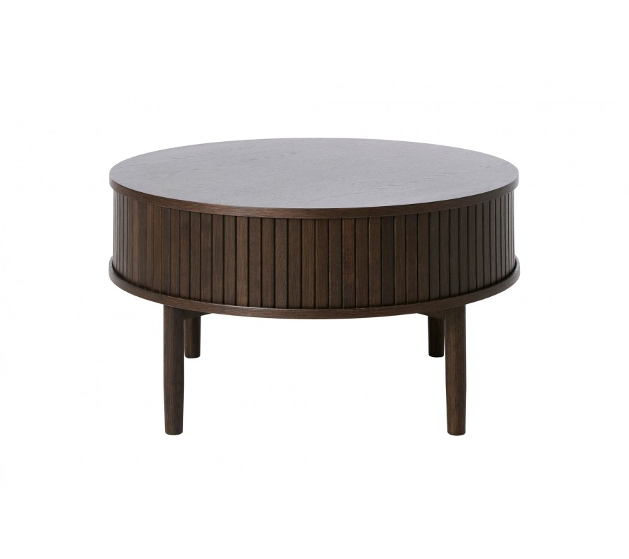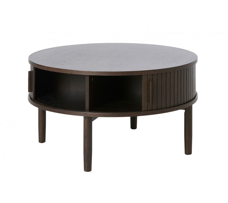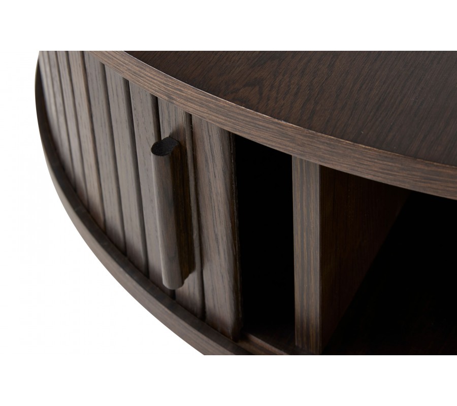 Retro kulatý dubový konferenční stolek Alborg s úložným prostorem s posuvnými lamelovými dvířky v tmavě hnědé barvě 85 cm