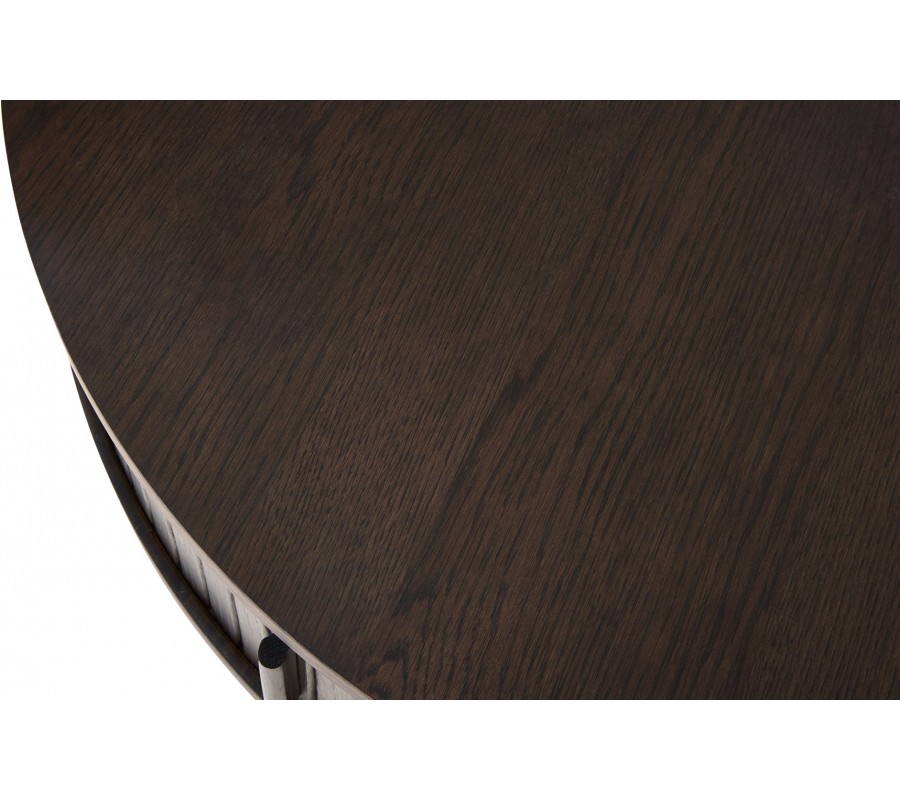 Horní deska má kulatý tvar a hladký povrch, pod kterým se ukrývá praktický úložný prostor. Ten je rozdělen na dvě části a uzavírá se pomocí dvojitých posuvných dvířek, které podtrhují retro vzhled stolku. Dvířka zdobí vertikální lamely a jsou tak nenápadně integrovány do celkového designu. Jednoduché zaoblené úchyty svou svislou orientací ladí s lamelovou strukturou.
