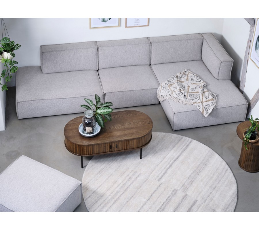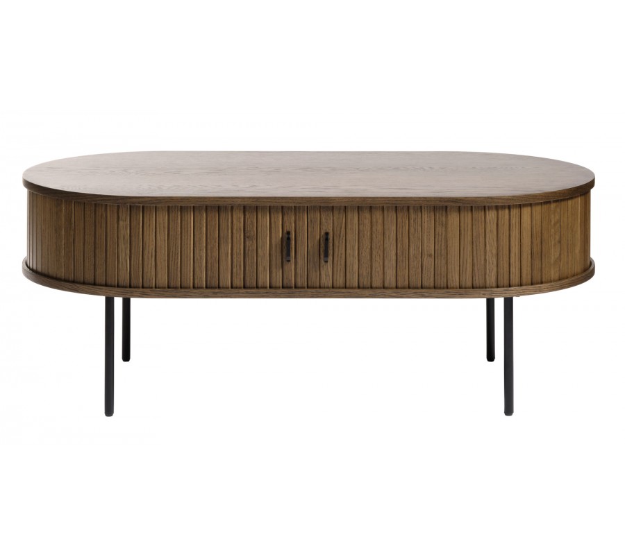 Vrchní deska má oválný tvar a na jejím hladkém povrchu se odvíjí pravidelná kresba dubového dřeva. Pod ní je umístěn nižší úložný prostor, jehož obvod zdobí vertikální lamely. Nenápadně integrovaná posuvná dvojitá dvířka jsou inspirována retro nábytkem.