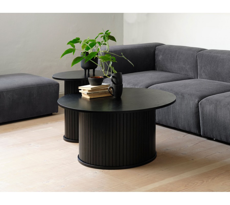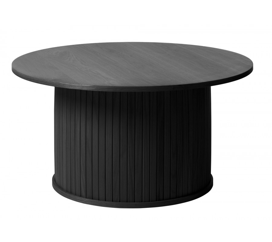 Moderní černý konferenční stolek Bornholm s kulatou deskou a širokou válcovitou nohou s lamelovým dekorem 90 cm