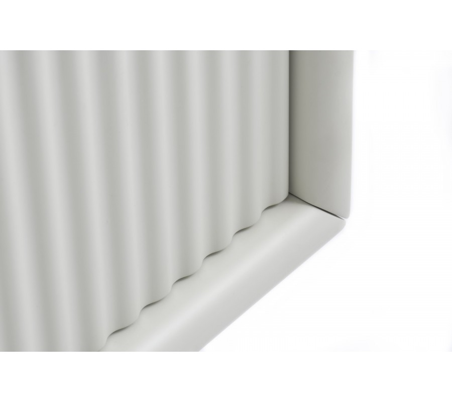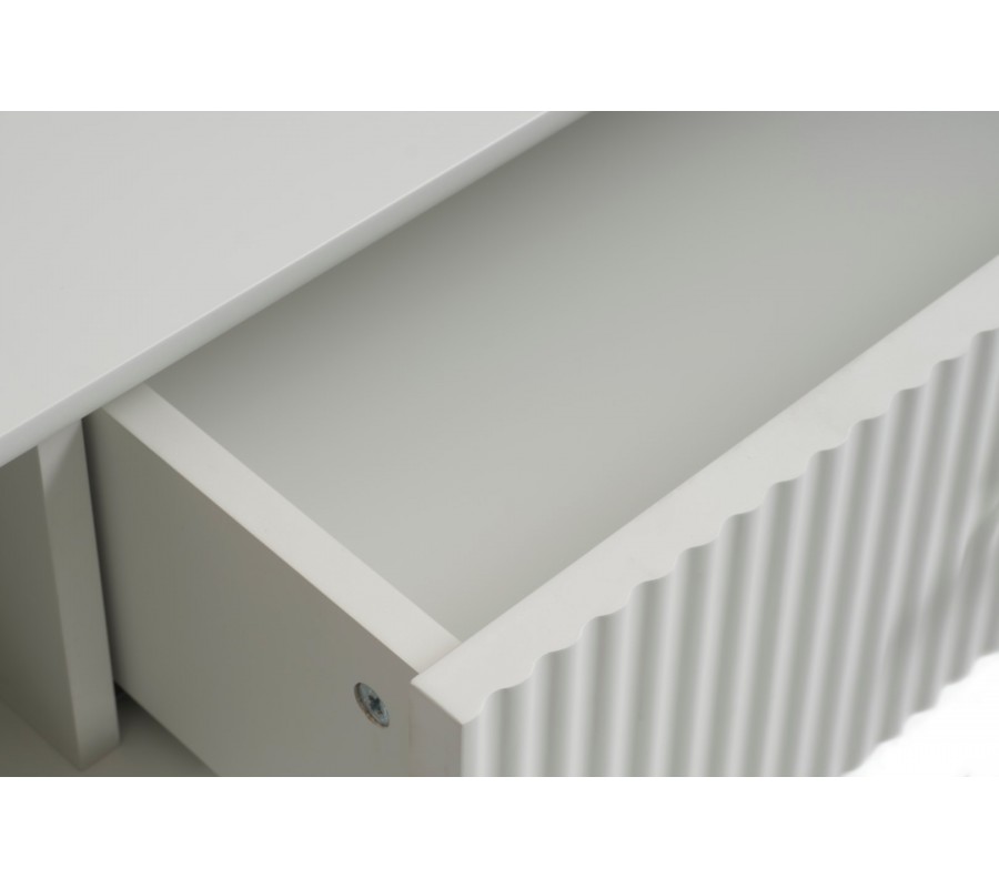 Stolek má hladkou obdélníkovou vrchní desku, pod kterou se nachází nižší úložný prostor. Je předělen na dvě poloviny. Jednu vyplňuje zásuvka s fasádou s žebrovaným reliéfem a druhou police s otevřenou přední stěnou. Zásuvku doplňuje válcovitá úchytka, která svým tvarem koresponduje se čtyřma nohama. Pro lepší stabilitu jsou propojeny výztuhou ve tvaru H. Úložný prostor na stranách výrazně přesahuje rámování podstavy a vytváří tak elegantní siluetu, inspirovanou art deco stylem.