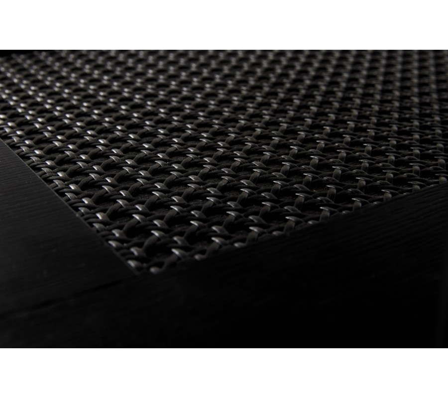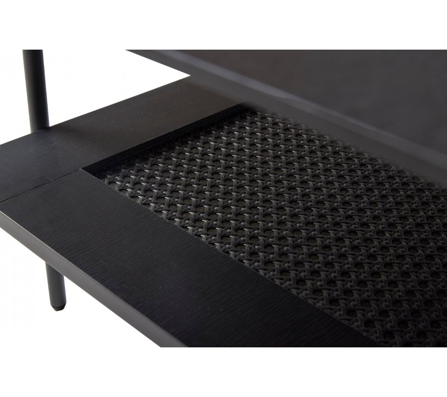 Ze stejného materiálu je vyroben také rám otevřené police. Její střed vyplňuje ratanový výplet, také v černém provedení. Vídeňský vzor působí elegantně a přináší do designu retro nádech.