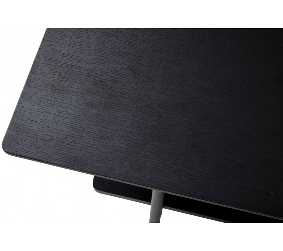 Stolek má moderní siluetu, ve které dominují štíhlé rovné linie, dodávající designu lehkost a vzdušnost. Vrchní deska má obdélníkový tvar, zjemněný zaoblenými rohy. Je vyrobena z kvalitní MDF dýhy s melaminovou povrchovou úpravou, zajišťující výbornou odolnost vůči teplu vlhku a otěru. Provedení v černé barvě doplňuje dubový dekor s jemnou pravidelnou kresbou letokruhů.