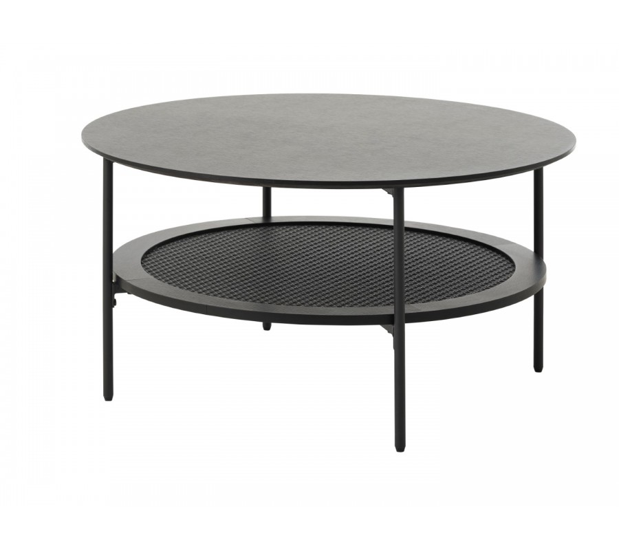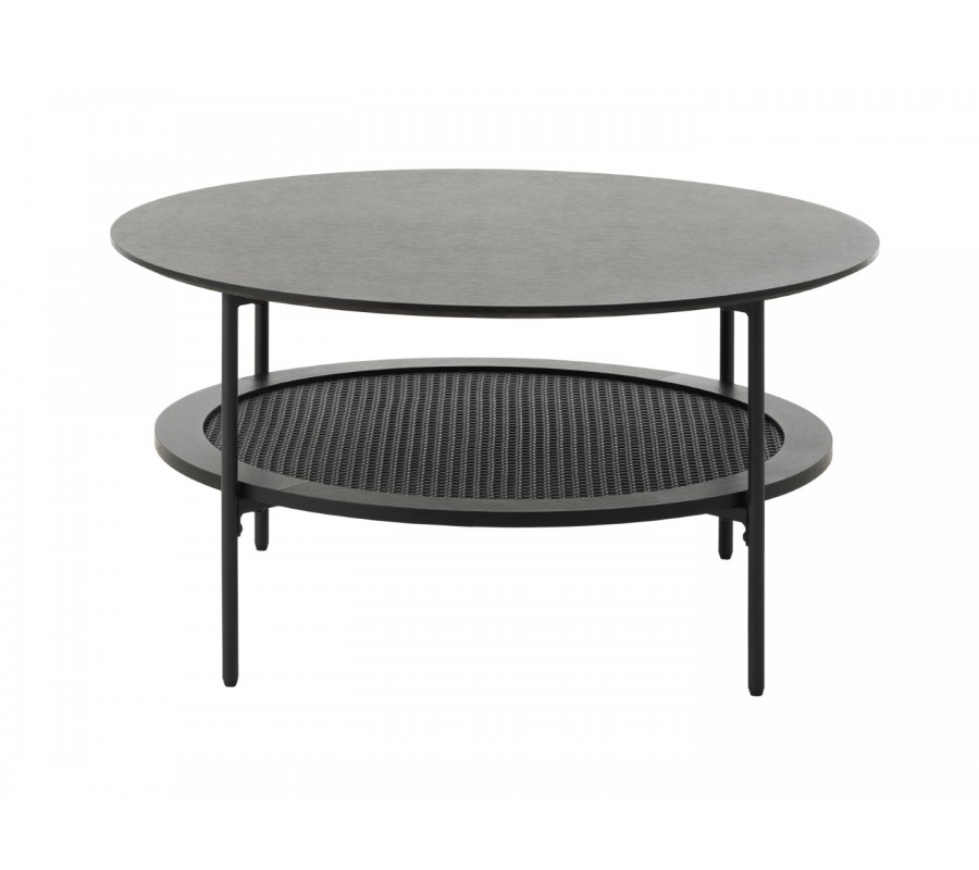 Industriální moderní černý konferenční stolek Malmo s kulatou vrchní deskou a policí s vídeňským ratanovým výpletem 80 cm