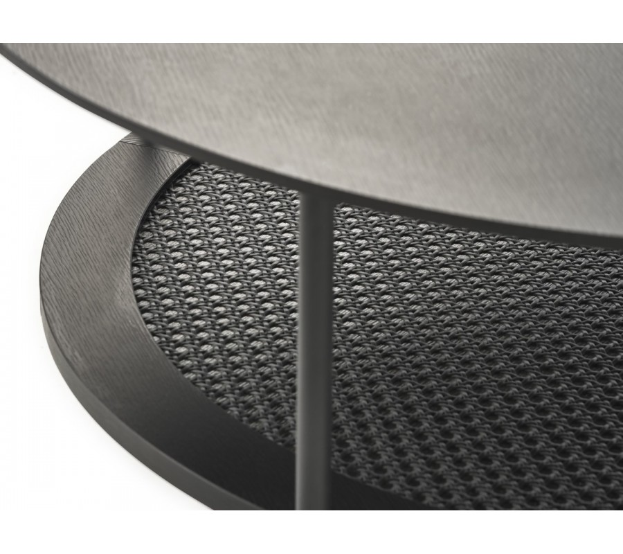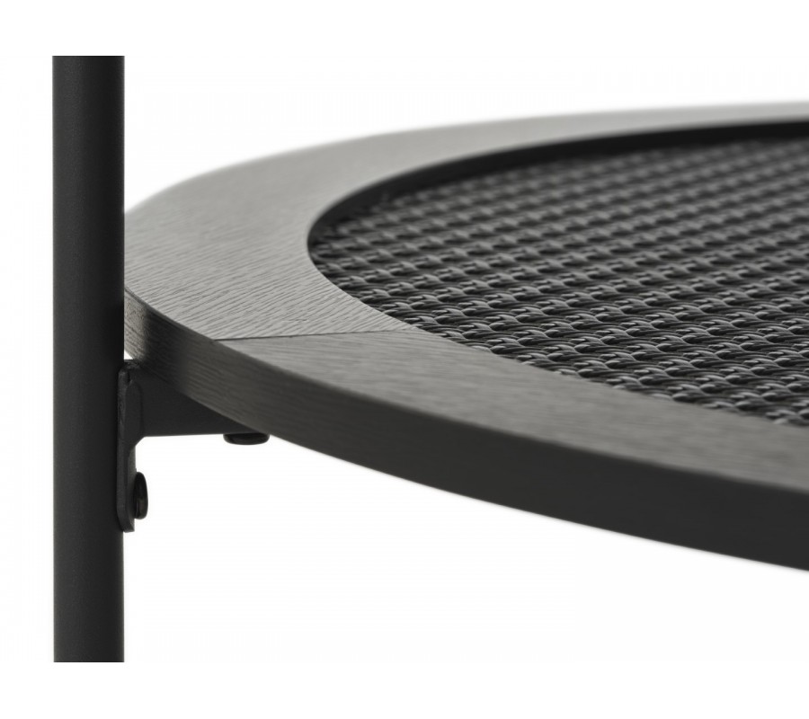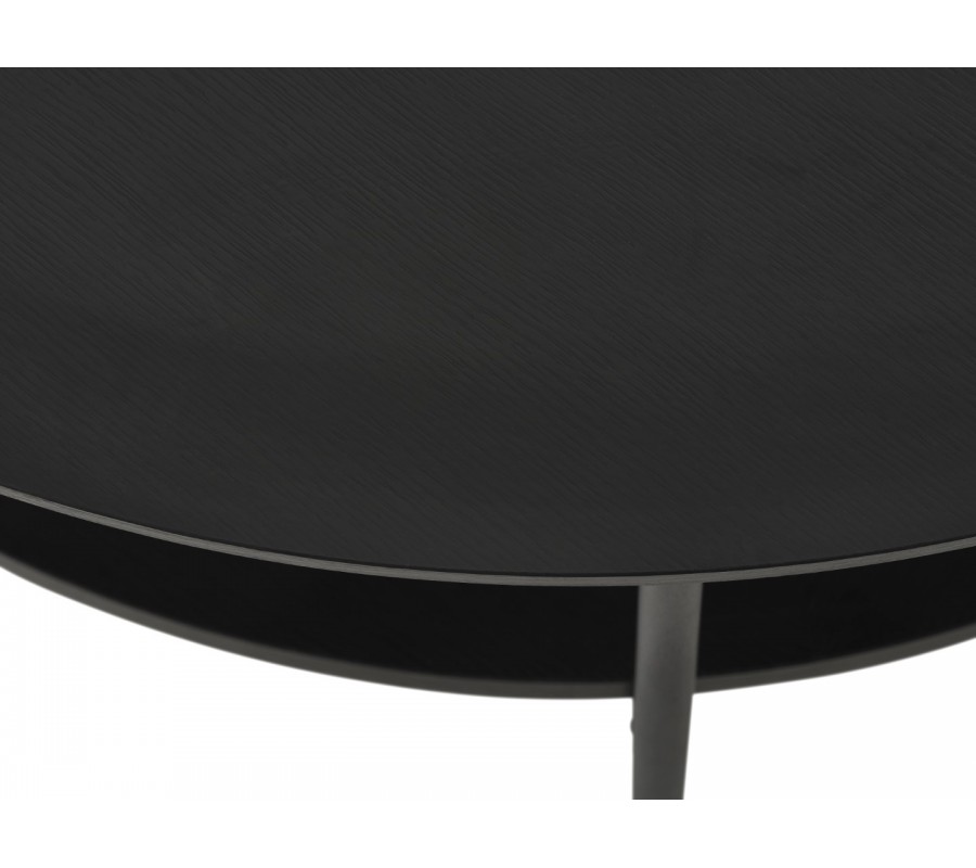 Stolek má hladkou kulatou vrchní desku, vyrobenou z kvalitní MDF dýhy s melaminovou povrchovou úpravou, zaručující výbornou odolnost vůči teplu, vlhku a mechanickému poškození. Černé provedení doplňuje jemná struktura letokruhů dřeva, která vytváří subtilní přírodní akcent.