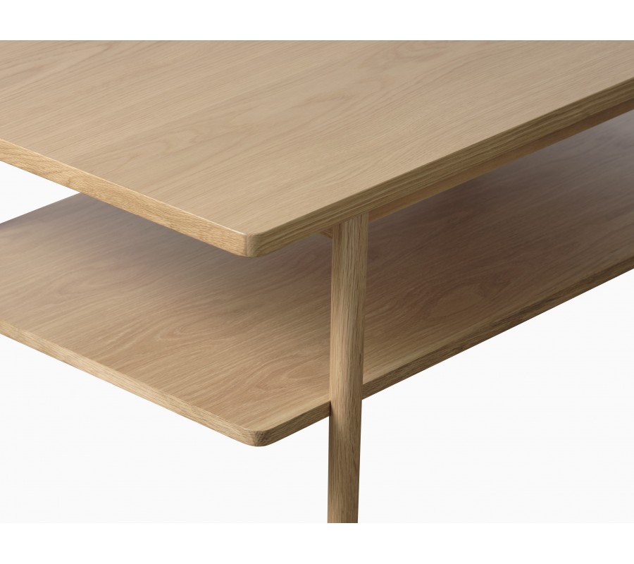 Vrchní deska má minimalistický obdélníkový tvar se zjemněnými zaoblenými rohy. Pod ní se nachází o něco menší police se stejnou siluetou. Ze spodní části je deska zpevněna obdélníkovým rámem, ke kterému se napojují čtyři vysoké válcovité nohy. Jsou umístěny na delších stranách, přičemž boční okraje desky a police vyčnívají do prostoru. Design tak působí vzdušně a odlehčeně.
