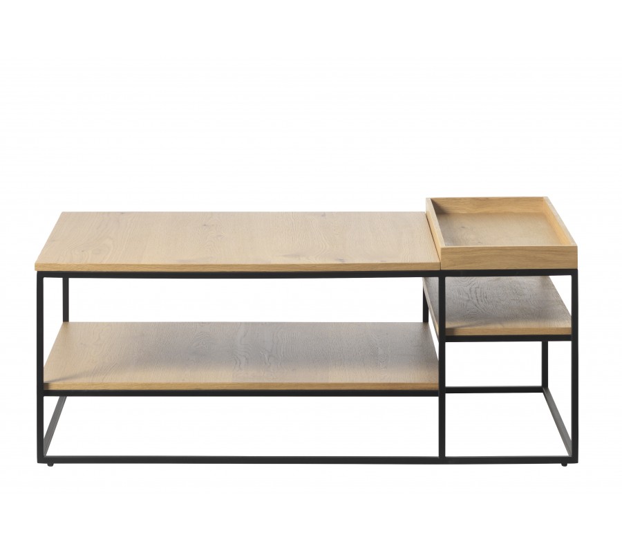 Design stolku je založen na jednoduchých liniích a čistých tvarech, které oživuje jemná asymetrie. Základ tvoří kovová konstrukce v matné černé barvě, která dodává celku industriální charakter, ale zároveň působí lehce a vzdušně. Příjemný kontrast vytváří dubová dýha ve světle hnědém odstínu se zachovanou přirozenou kresbou dřeva, díky čemuž působí stolek teplo a přirozeně.