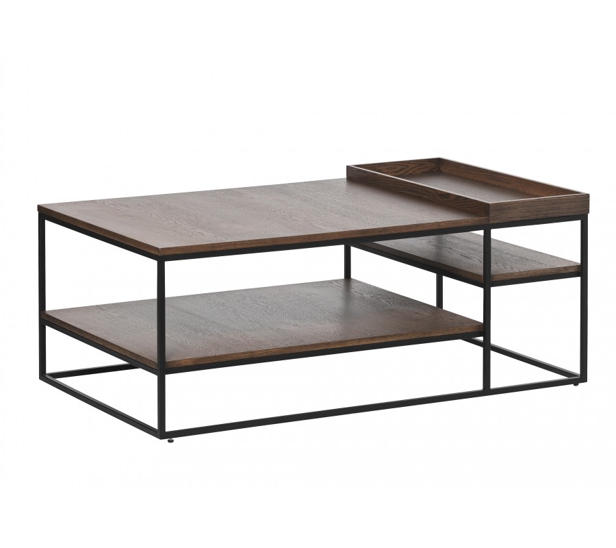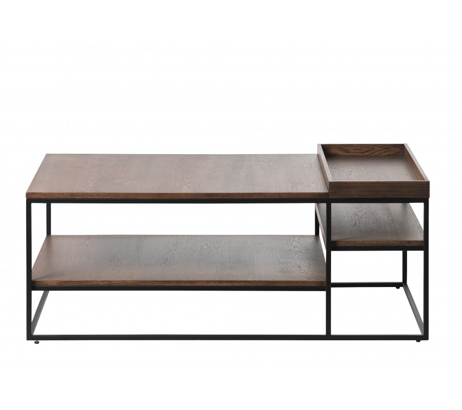 Stolek má lineární siluetu, ve které dominují čisté minimalistické tvary, ozvláštněné jemnou asymetrií. Základ tvoříkonstrukce z kovu v matném černém provedení, která dodává nábytku industriální výraz. Její štíhlé linie působí vzdušně a prostor tak vizuálně nezatíží. Výborně ji doplňuje pravá dubová dýha v tmavém hnědém provedení se zachovalou strukturou dřeva, která přináší do designu teplý přírodní akcent.