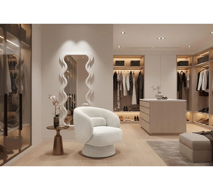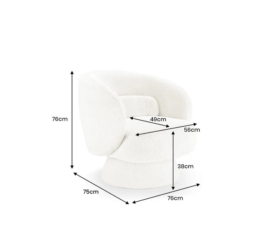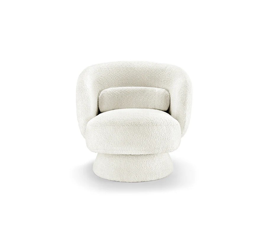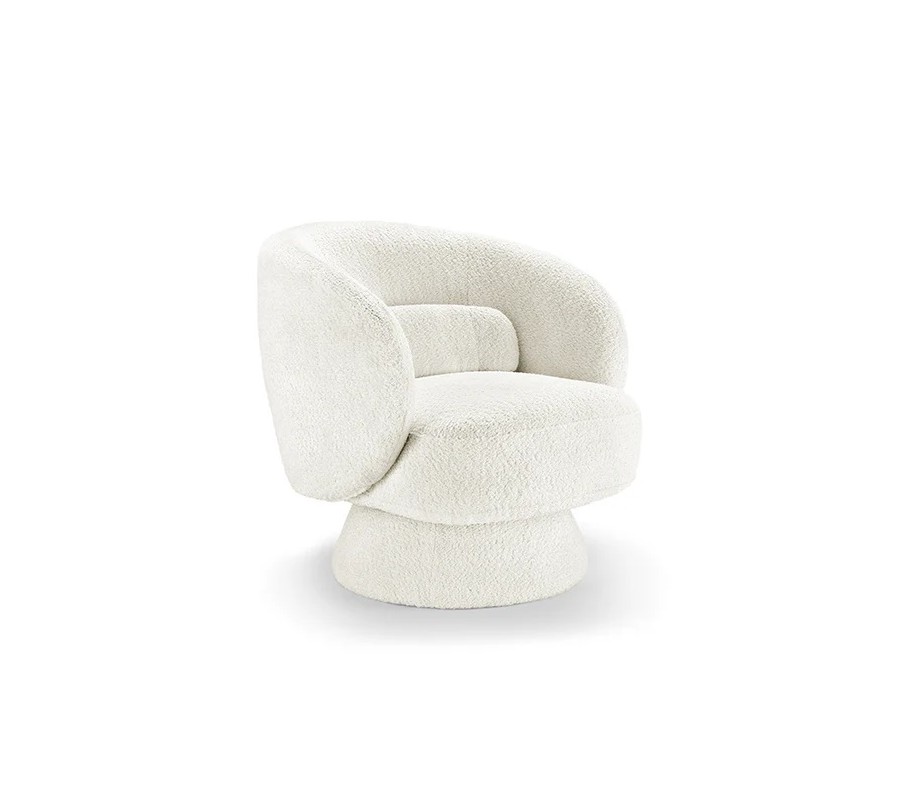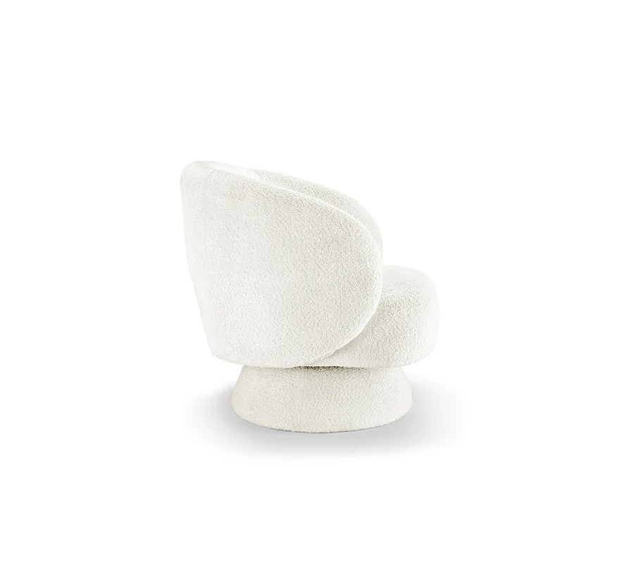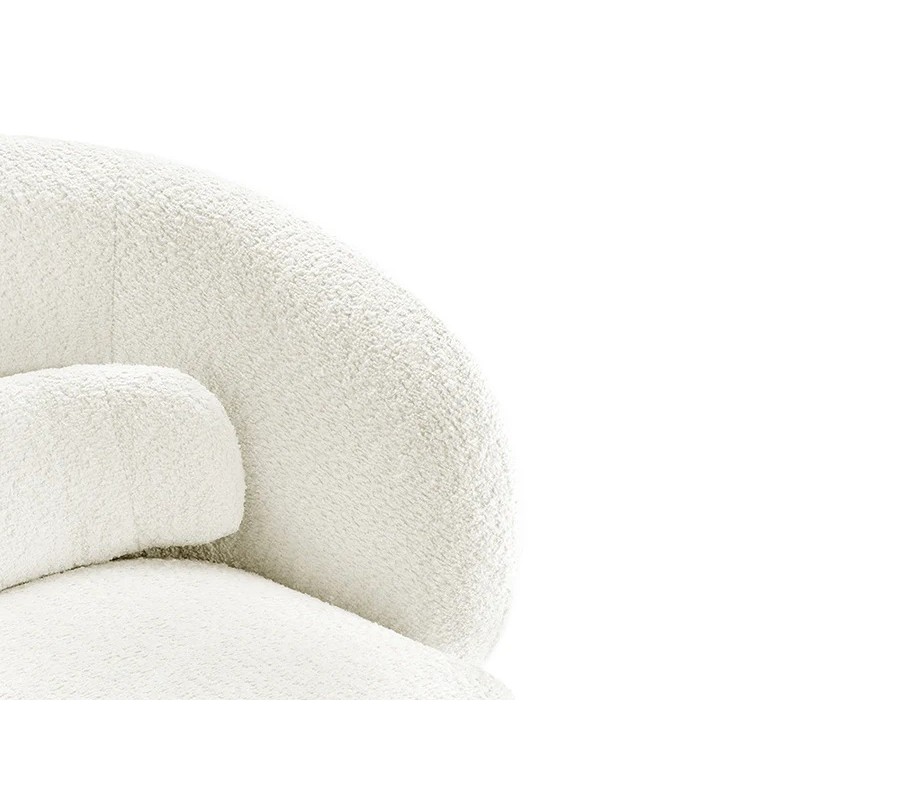Křeslo je čalouněno bílým buklé potahem, který je měkký, jemně strukturovaný a mimořádně příjemný na dotek. Tento materiál patří mezi oblíbené stálice interiérového designu a v spojení s moderním tvarem dodává křeslu sofistikovaný, ale zároveň útulný charakter. Zaoblené opěradlo spolu s integrovaným polštářkem poskytují pohodlnou oporu zad a zvyšují komfort při sezení.