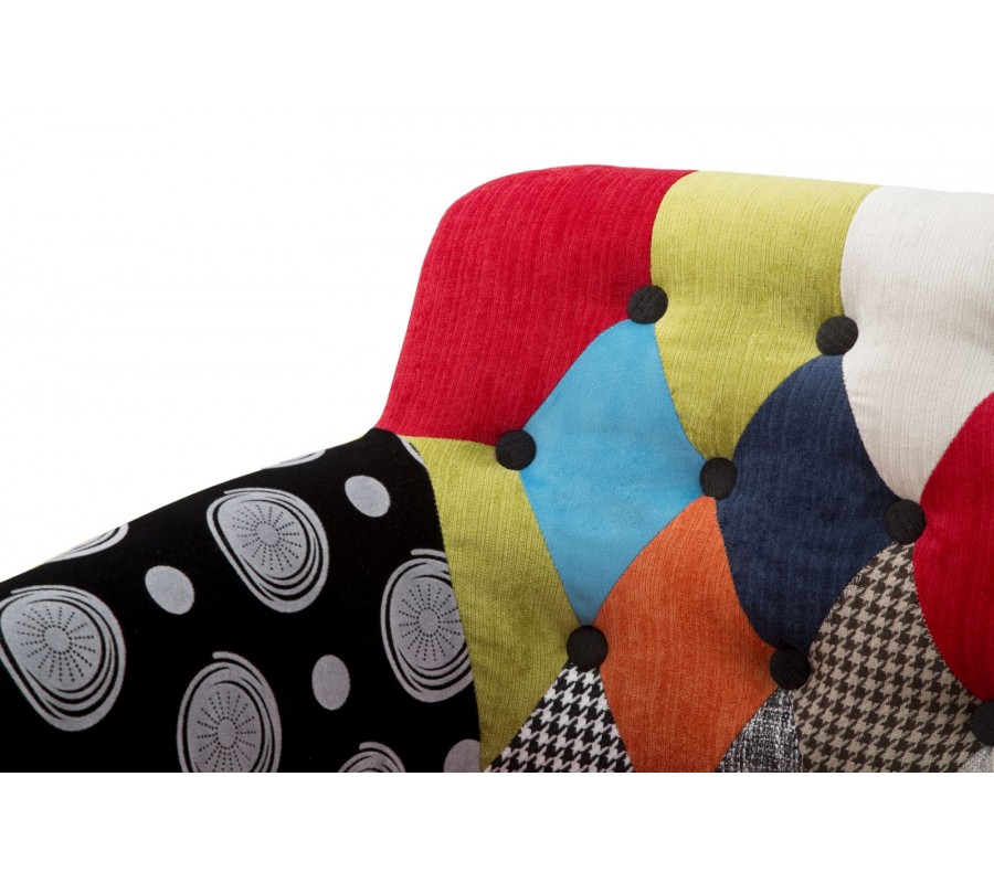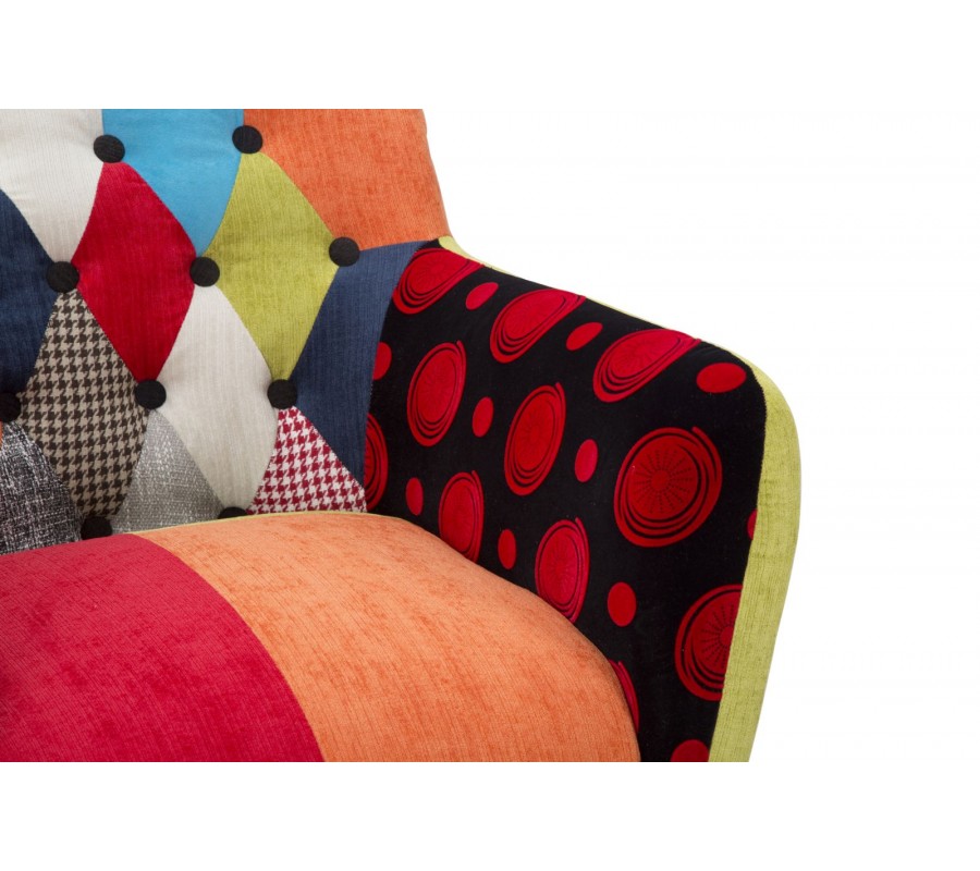 Křeslo má pevnou dřevěnou konstrukci, která je ve vrchní části pokryta pěnovým čalouněním a textilním potahem. Potah má půvabný patchworkový vzor, který spojuje výrazné pastelové barvy a kulatých ozdobných knoflíků na vnitřní straně zádové opěrky. Toto prošívání zdůrazňuje měkký a pohodlný vzhled a zároveň výborně koresponduje s kosočtvercovým vzorem textilu.