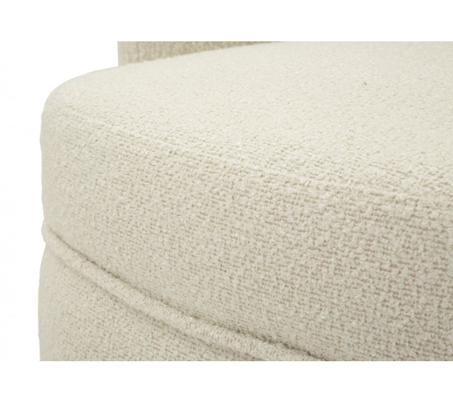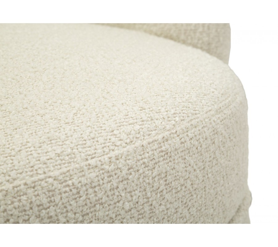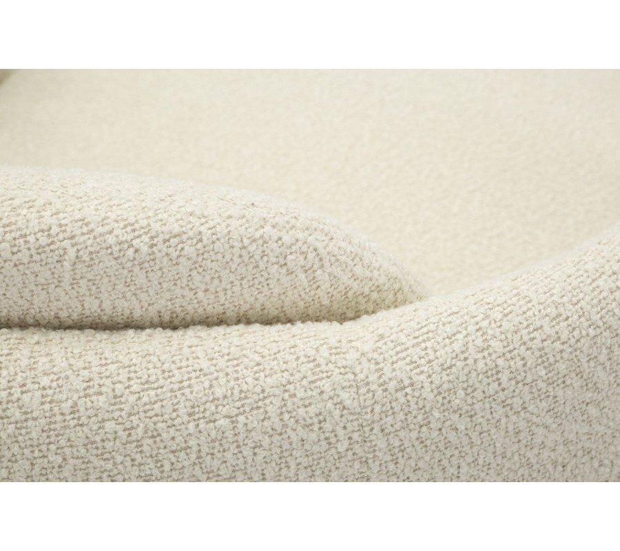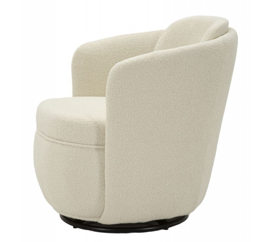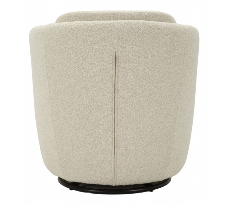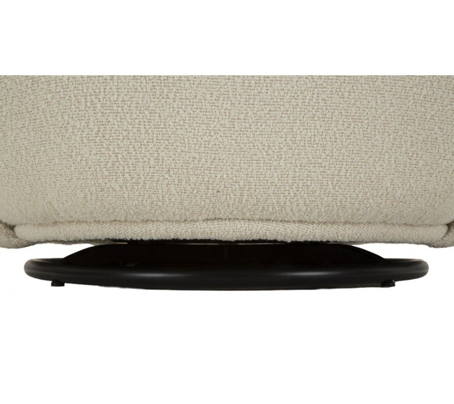 Designové klubové bouclé křeslo Meron v krémové barvě je stylový kousek s otočnou funkcí a černou kovovou podstavou, která mu dodává moderní vzhled. Potah z jemné bouclé látky působí útulně a elegantně, přičemž vzadu má zip, díky čemuž je odnímatelný a snadno udržovatelný.