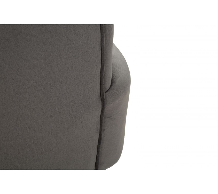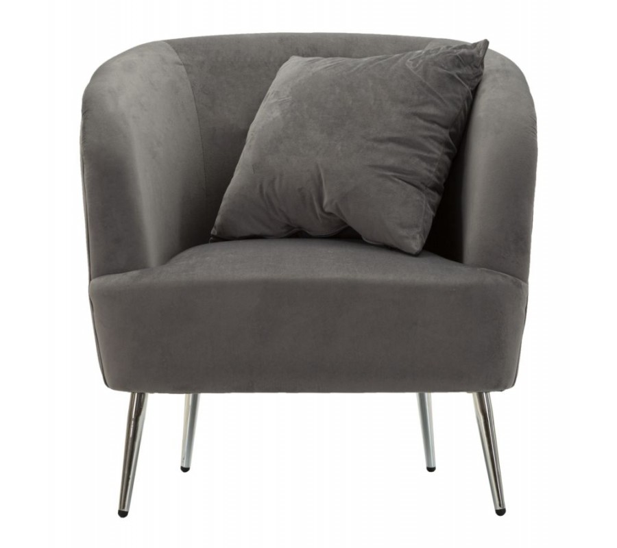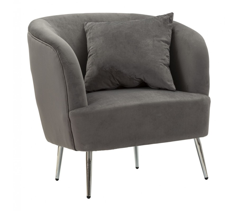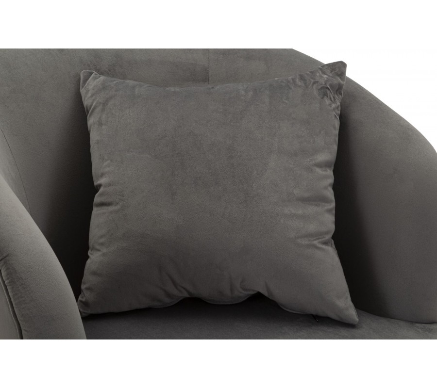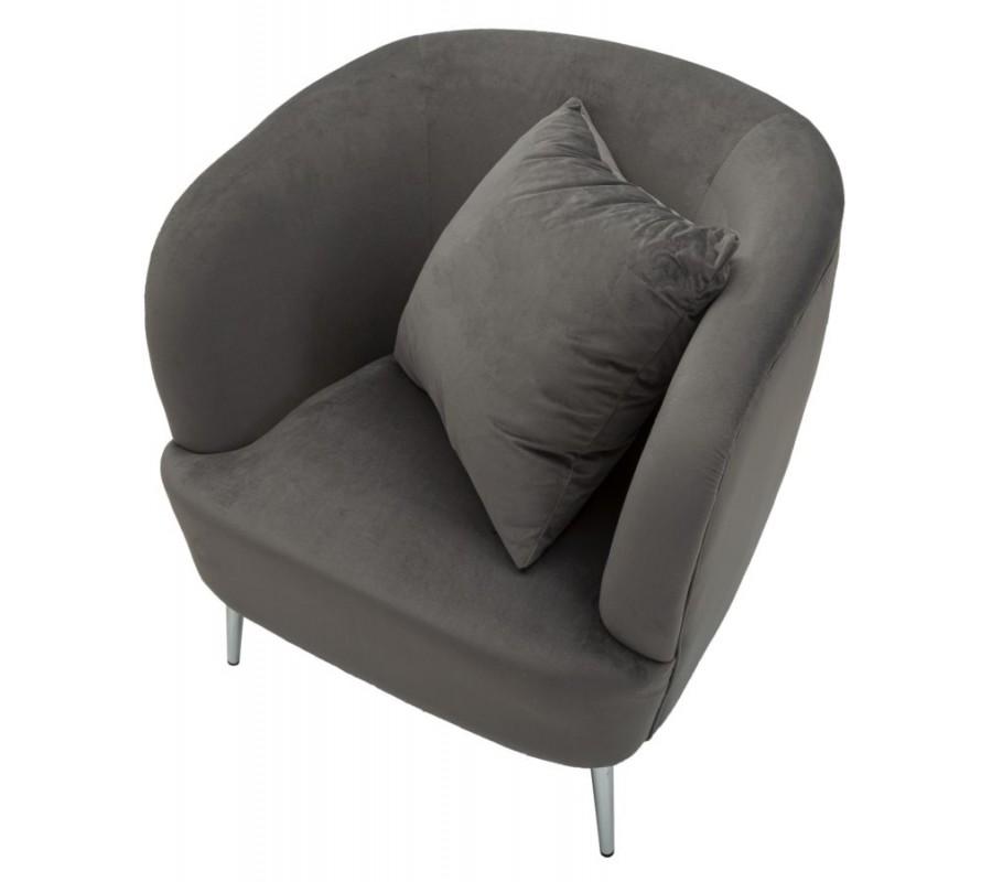 Křeslo má elegantní siluetu se zaoblenou opěrkou, která ohraničuje sedací část na třech stranách. Pevnou dřevěnou konstrukci pokrývá pěnová výplň a na dotek příjemný sametový potah v šedé barvě. Čtvercový polštář je vyroben ve stejném provedení.