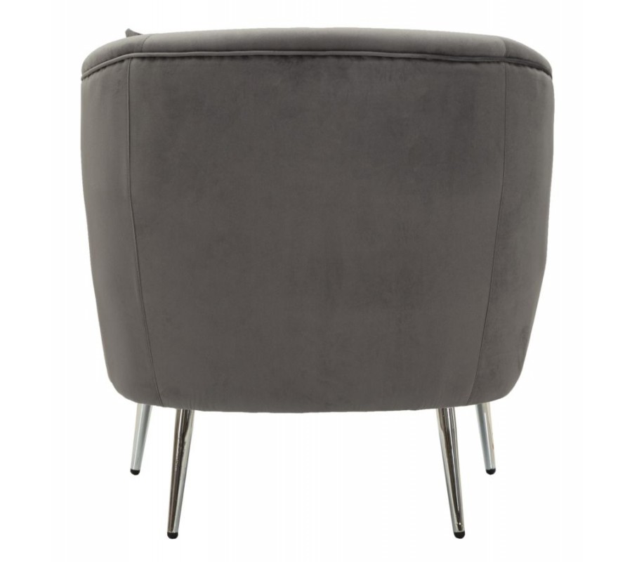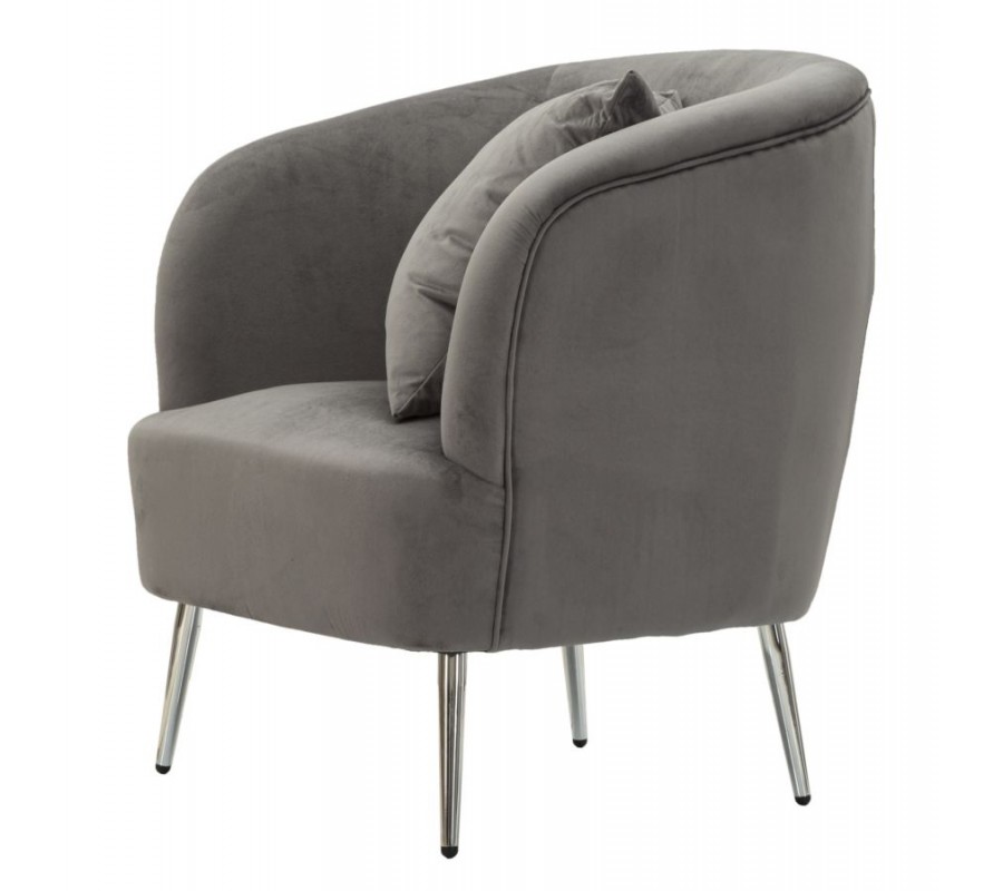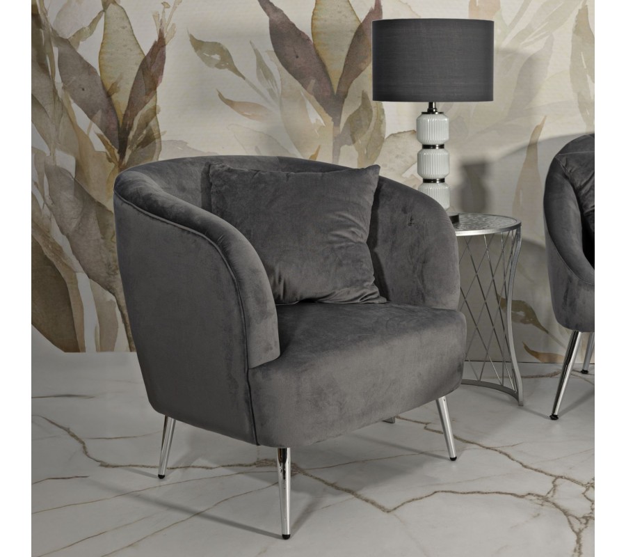 Moderní glamour křeslo Cally s polštářem s šedým sametovým čalouněním a lesklými chromovými nožičkami 78 cm