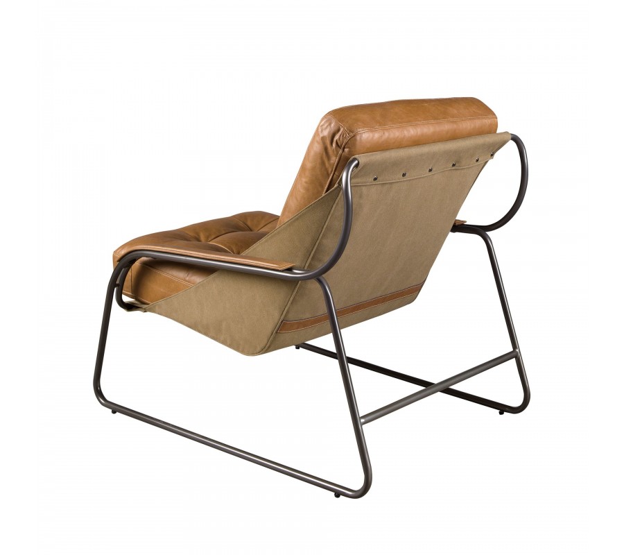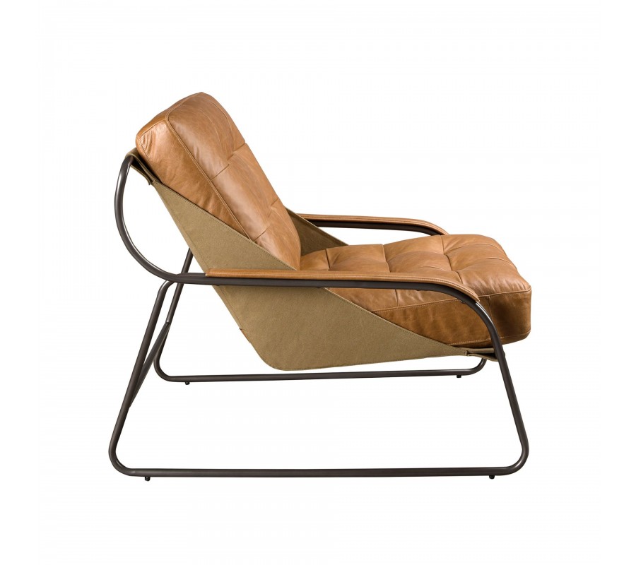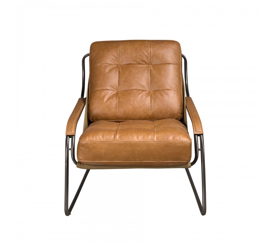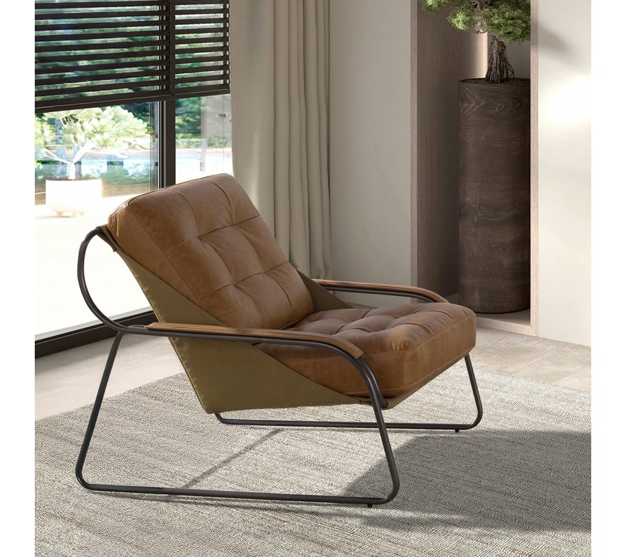 Sedadlo a zádová opěrka mají obdélníkový tvar a jsou bohatě čalouněné. Potah je vyroben z pravé kůže v teplém hnědém odstínu a zdobí jej minimalistické prošívání se čtvercovým vzorem s hlubokými vtaženými body. Stejný potah, ale bez čalounění, překrývá i vrchní část bočních opěrek a poskytuje tak pohodlnější opření. Ze spodní a zadní strany je zpevňuje kůže ve světlejším hnědém odstínu, upevněná na kovové konstrukce. Vytváří subtilní barevný kontrast a přiznané konstrukční prvky přinášejí do designu jemný nádech industriálního stylu.