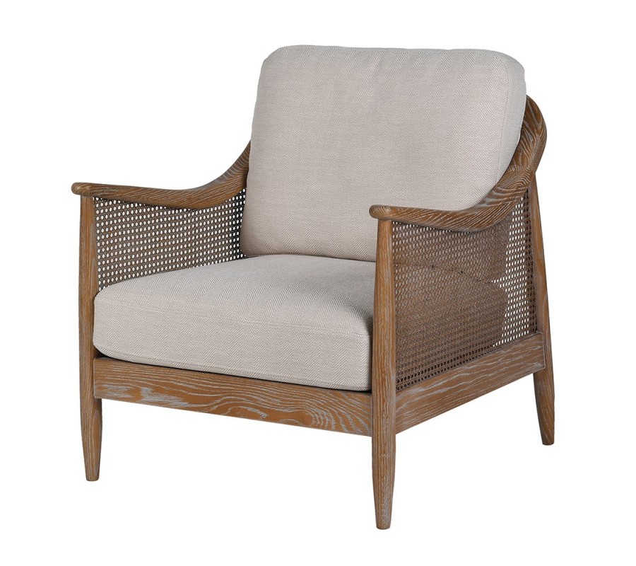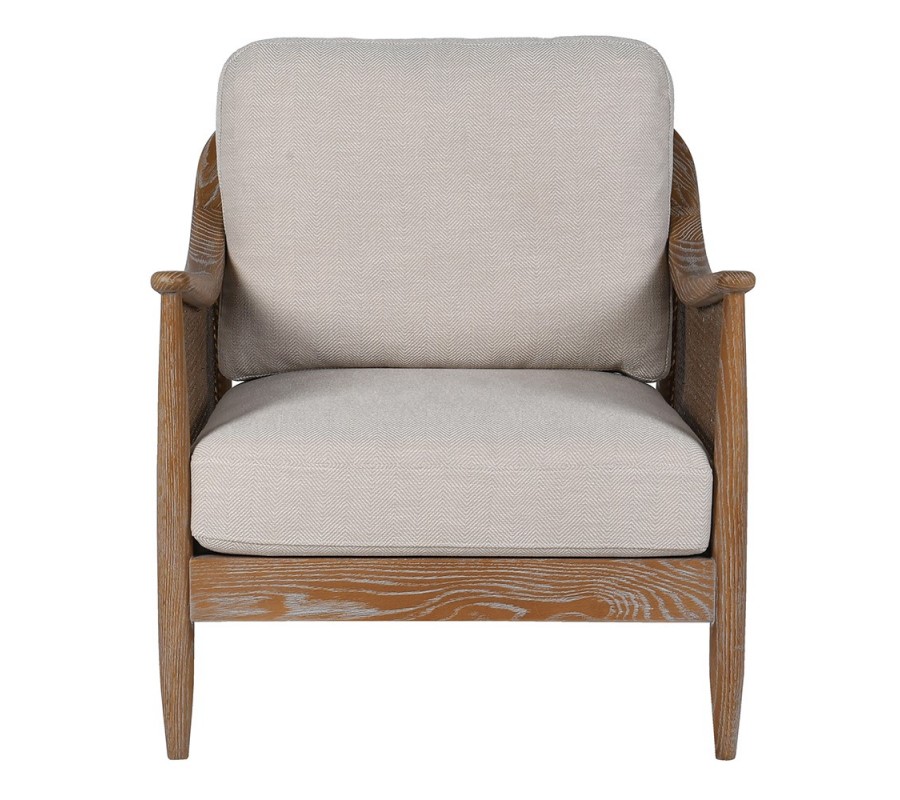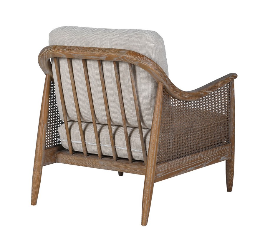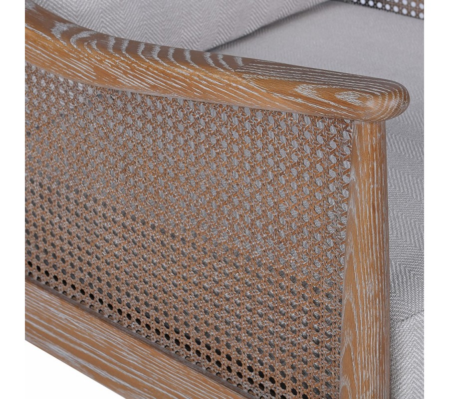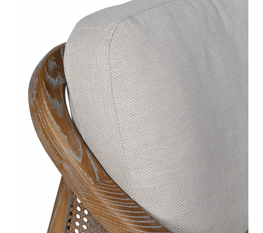 Sedadlo i opěradlo tvoří komfortní obdélníkové polštáře s čalouněním v jemně šedé textilii, která je měkká na dotek a příjemná k sezení. Spojení dřeva, výpletu a textilu vytváří harmonický celek, který působí nadčasově a luxusně.