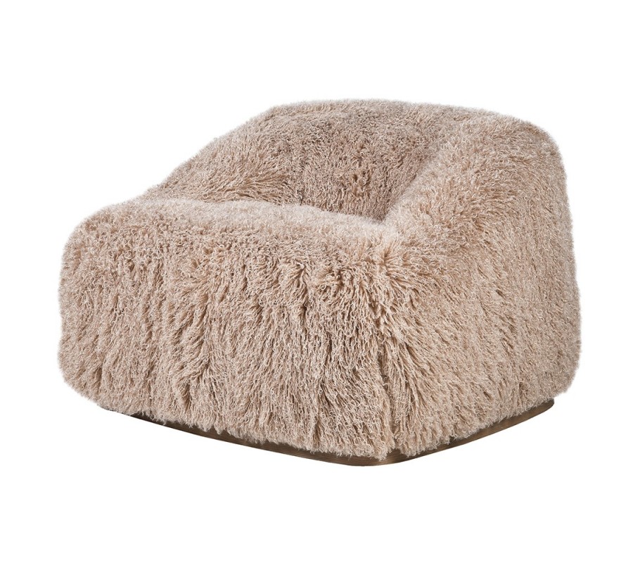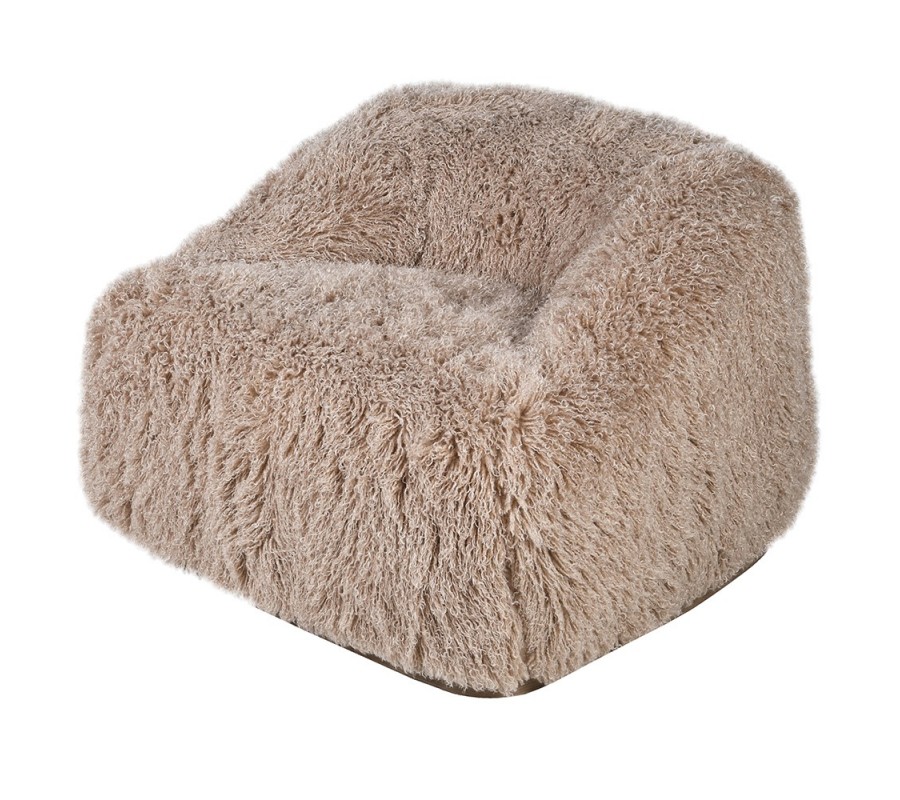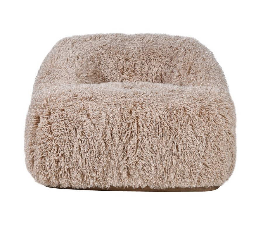 Luxusní glamour křeslo Cloudy je designový solitér, který okamžitě upoutá pozornost svým originálním vzhledem. Působí jako velký polštář nebo sedací vak, avšak ve skutečnosti ukrývá pevný dřevěný rám, který zajišťuje stabilitu a dlouhou životnost. Je čalouněno do měkké kožešinové textilie v taupé hnědé barvě s dlouhým vlasem, která vytváří dojem nadýchanosti a neodolatelného komfortu.