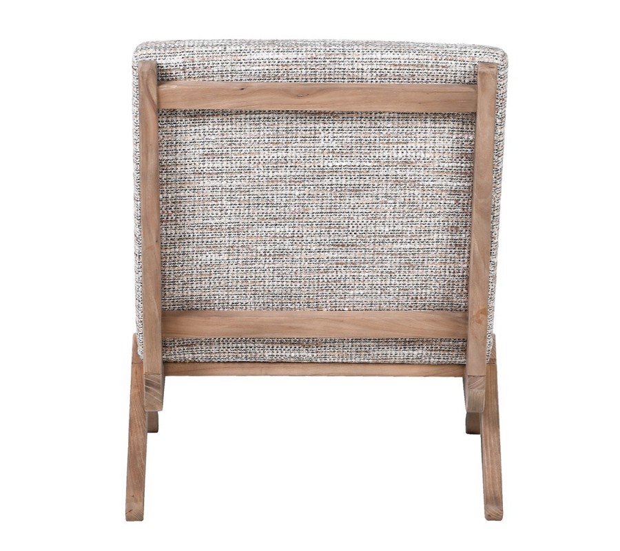 Dřevěná konstrukce v ořechovém hnědém odstínu tvoří výrazný designový prvek. Nožičky mají dynamický architektonický tvar, kde se jejich horní linie jemně protínají, což připomíná motiv zkřížení, ale zachovává čistý a stabilní profil. Jejich mírné vyosení dopředu a dozadu dodává křeslu rovnováhu a vizuální lehkost.