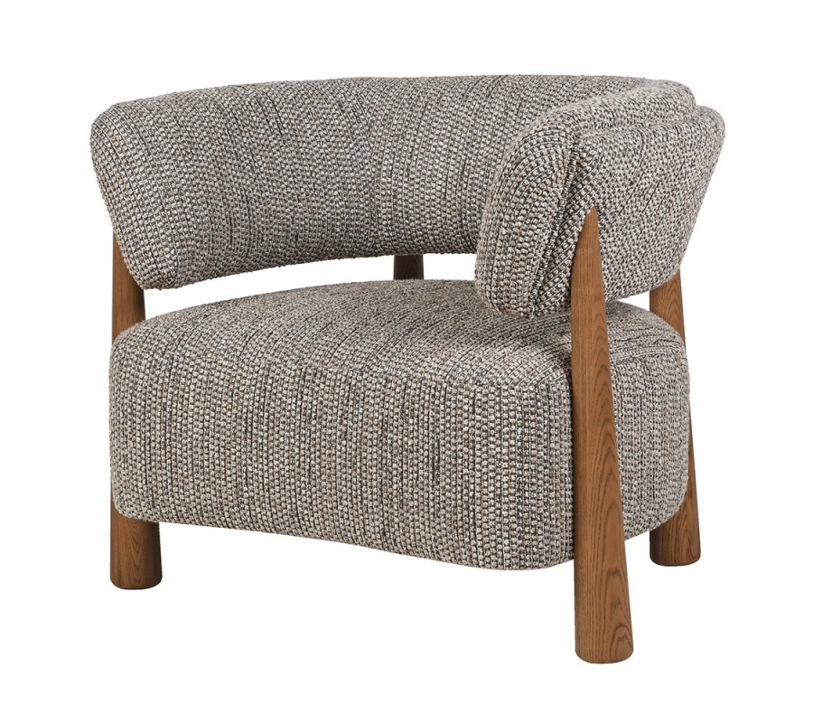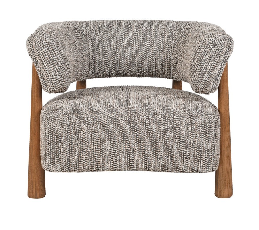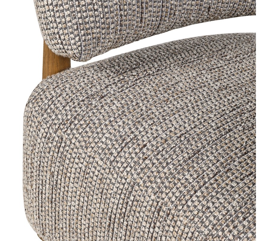Potah je vyroben z mikrovlákna, které mu zaručuje výbornou odolnost vůči vlivům každodenního používání. Tkaní s výraznou strukturou vytváří v kombinaci s melírovaným provedením v hnědých, šedých a béžových odstínech vizuální hloubku. S touto zemitou paletou krásně koresponduje naturální hnědé provedení nožiček s přiznanou kresbou letokruhů a křeslo tak působí teplým a útulným dojmem.