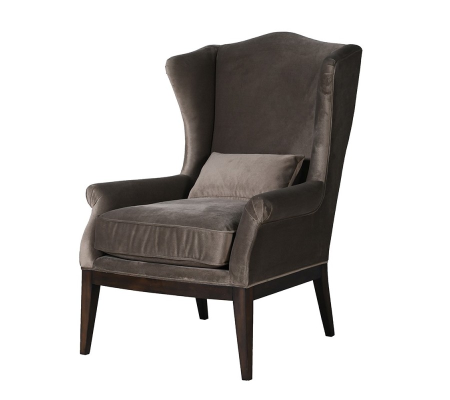 Luxusní klasické křeslo ušák Jude se sametovým šedým potahem a vysokou opěrkou s hnědým dřevěnýma nohama 114 cm
