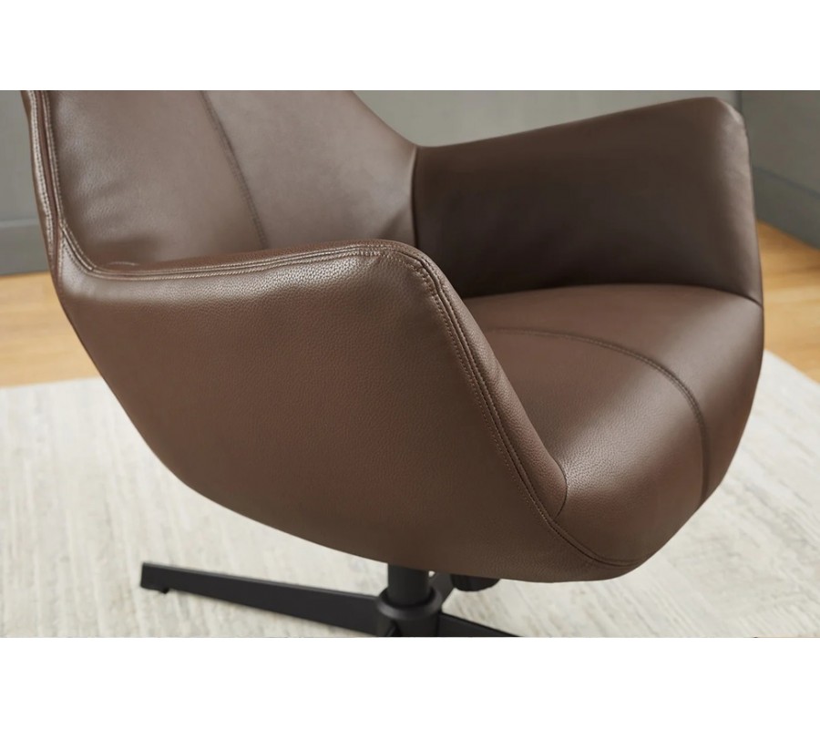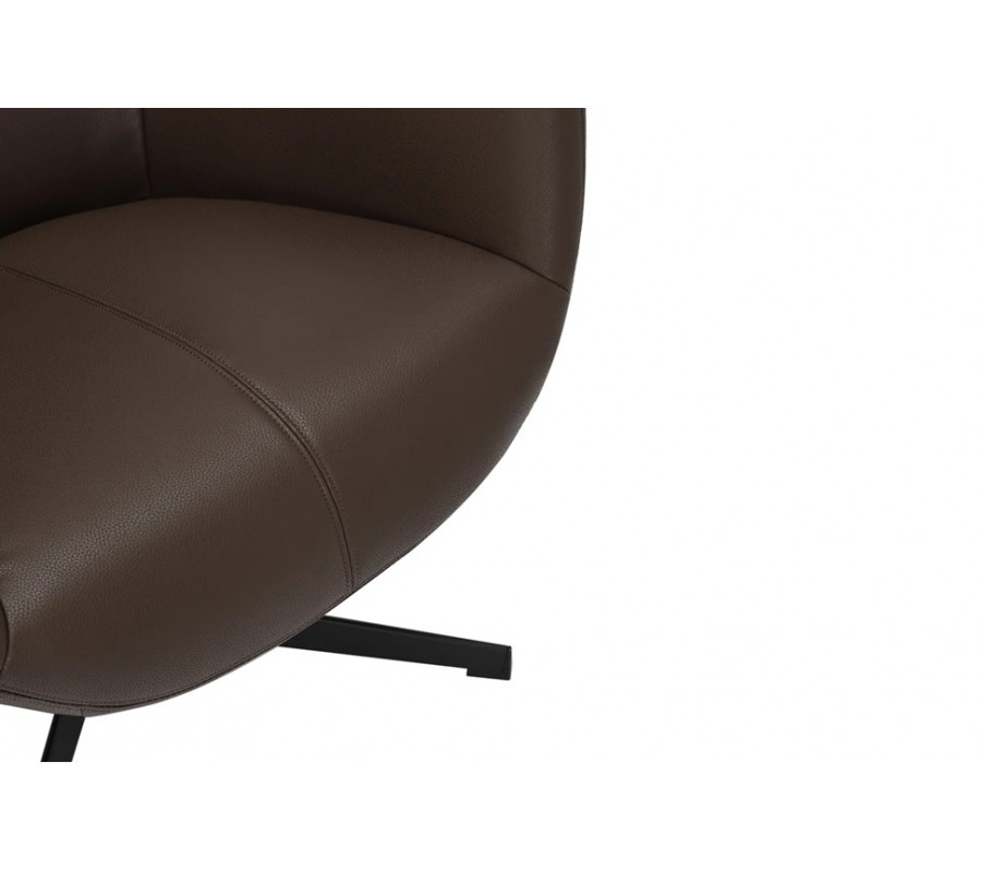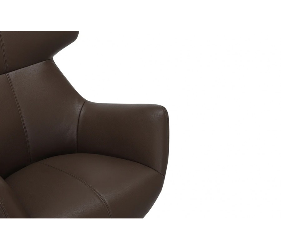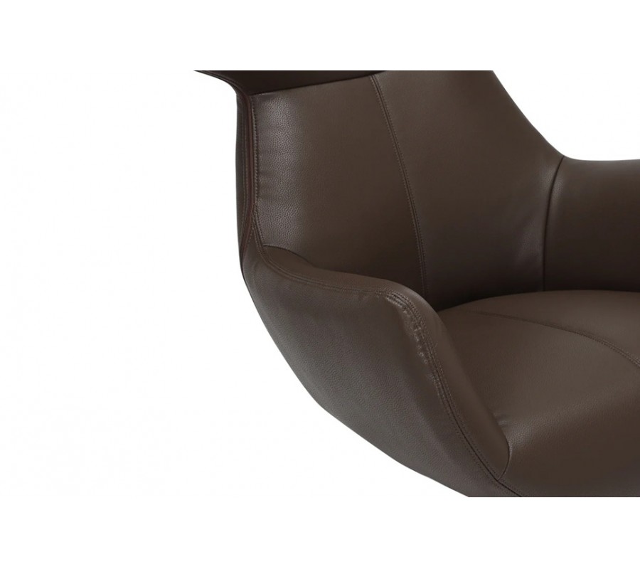 Pěnová výplň zjemňuje geometričnost designu a potah z ekokůže má hladký, na dotek příjemný povrch. Zdobí ho minimalistické prošívání se spojích a jedna dominantní linie procházející středem křesla. Teplá zemitá hnědá barva design zútulňuje.