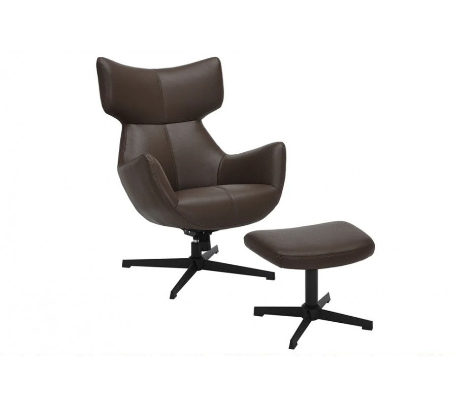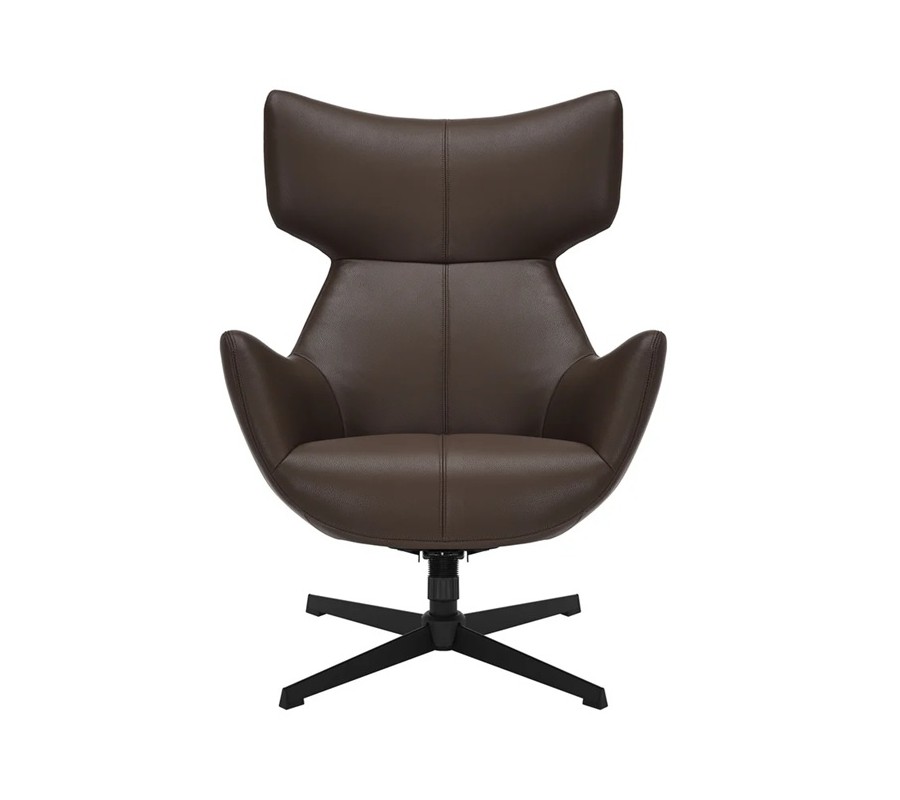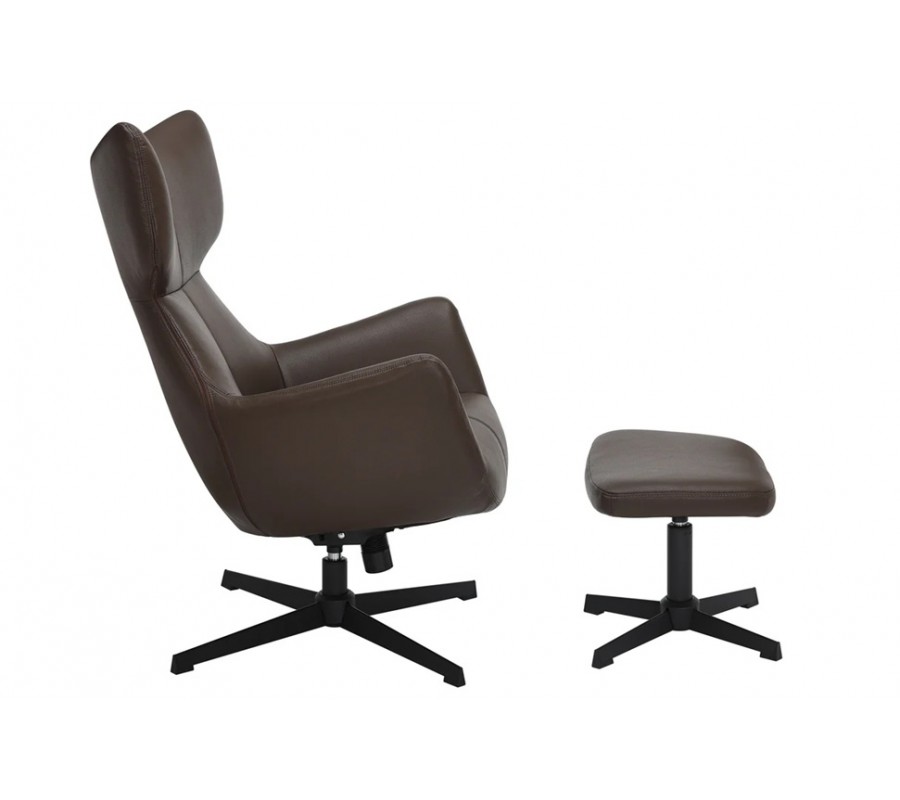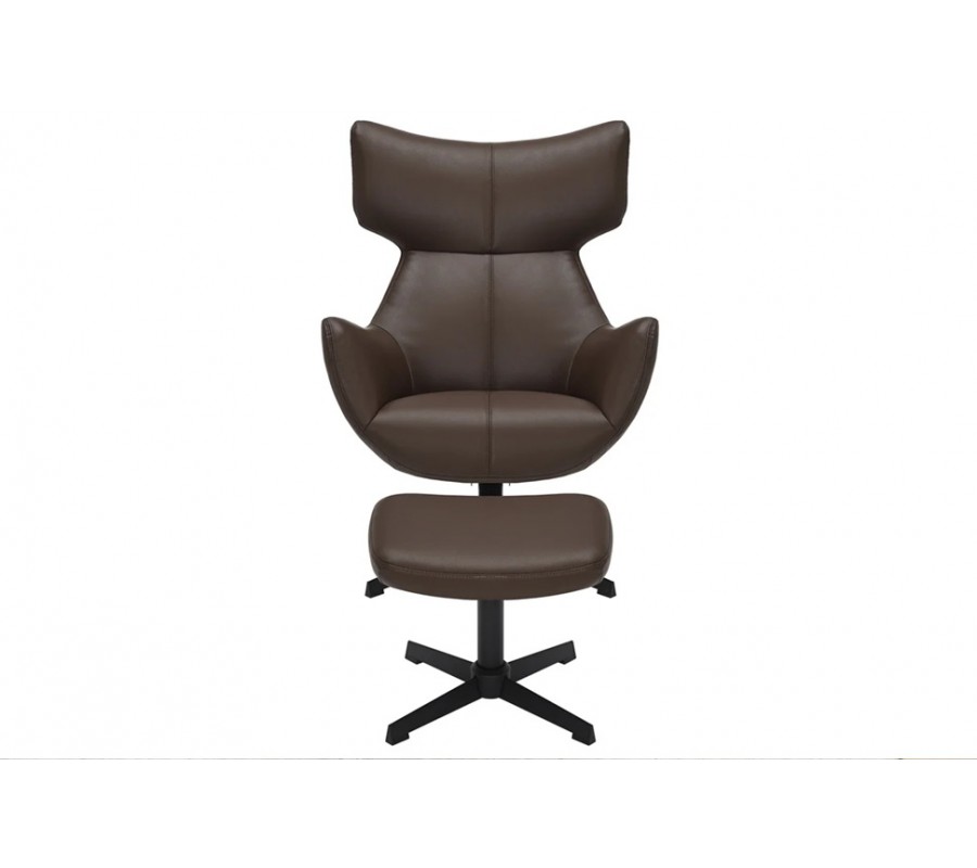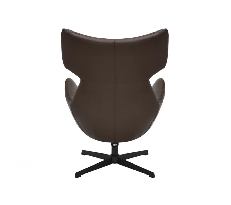 Pěnová výplň zjemňuje geometričnost designu a potah z ekokůže má hladký, na dotek příjemný povrch. Zdobí ho minimalistické prošívání se spojích a jedna dominantní linie procházející středem křesla. Teplá zemitá hnědá barva design zútulňuje.