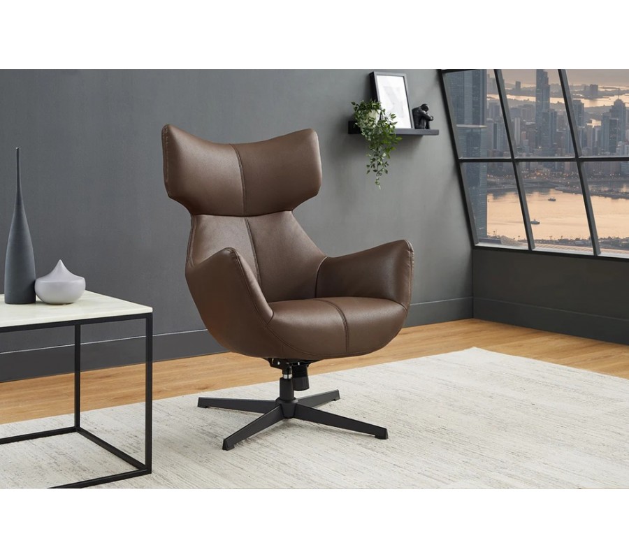 Moderní industriální kožené křeslo Krespa s hnědým potahem a otočným sedátkem s možností zaklonění 75 cm