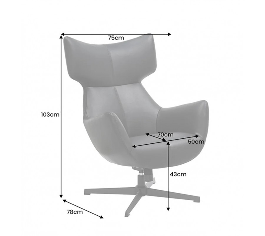 Křeslo má mohutnou sedací část s vysokou zádovou opěrkou, kterou ve vrchní části doplňuje rozšířená opěrka na hlavu. Zešikmené linie působí moderně a dynamicky, zatímco ergonomické zakřivení se přizpůsobí tělu. Sedadlo má ve spodní části výrazně zaoblený tvar, který v polobloukové linii přechází do nižších opěrek na ruce s rovnou vrchní stranou.