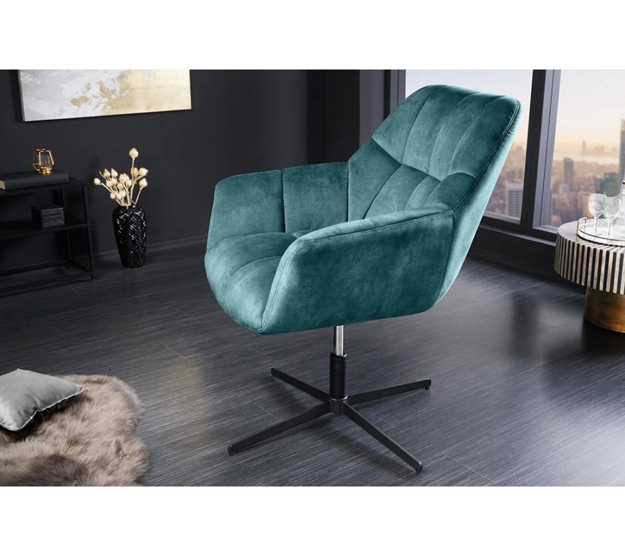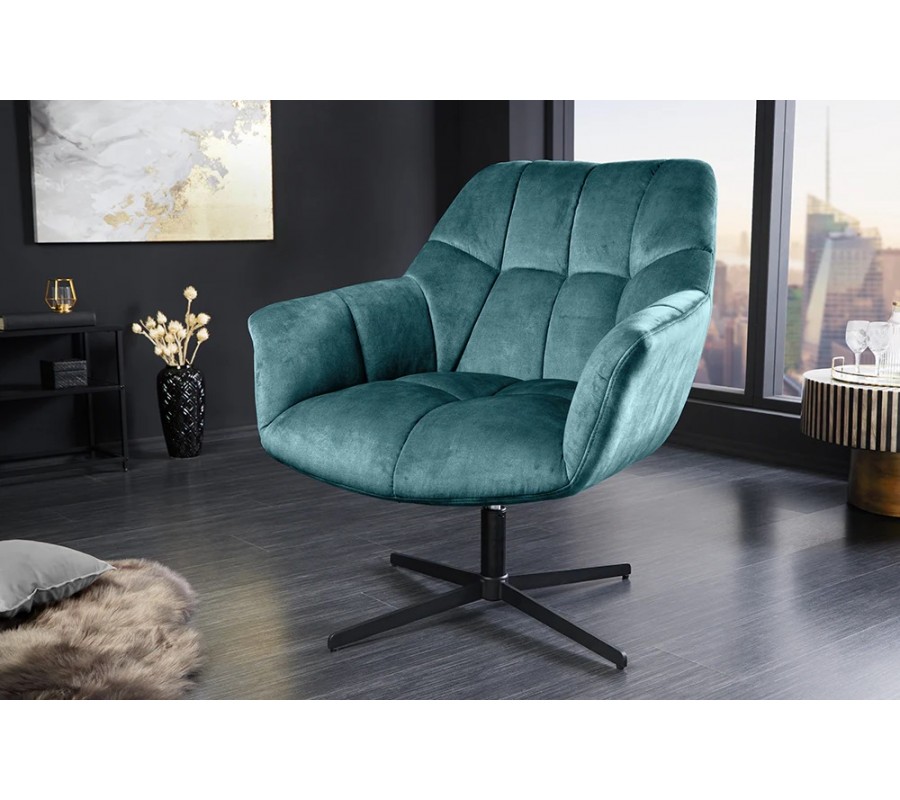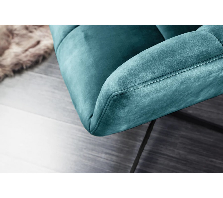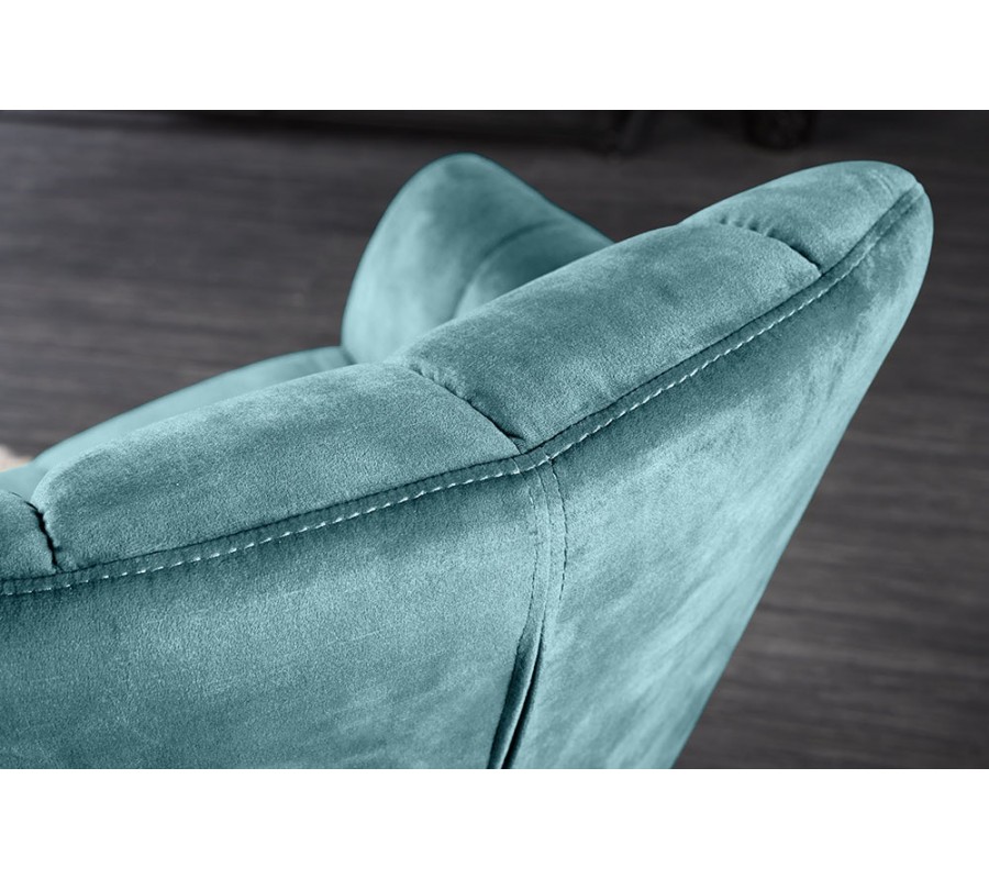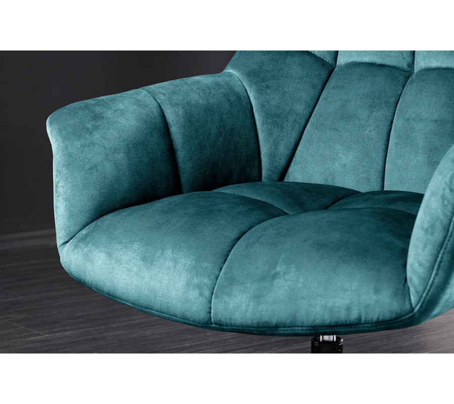 Křeslo má mohutnou sedací část, otočnou o 360°. Čalounění jí dodává jemně zaoblené tvary a potah z mikrovlákna zaručí výbornou odolnost vůči vlivům každodenního používání. Sametová povrchová úprava je příjemná na dotek a krásné modrozelené tealové barvě dodává jemný lesk. Lineární prošívání se vzorem čtverců podtrhuje moderní vizuál.