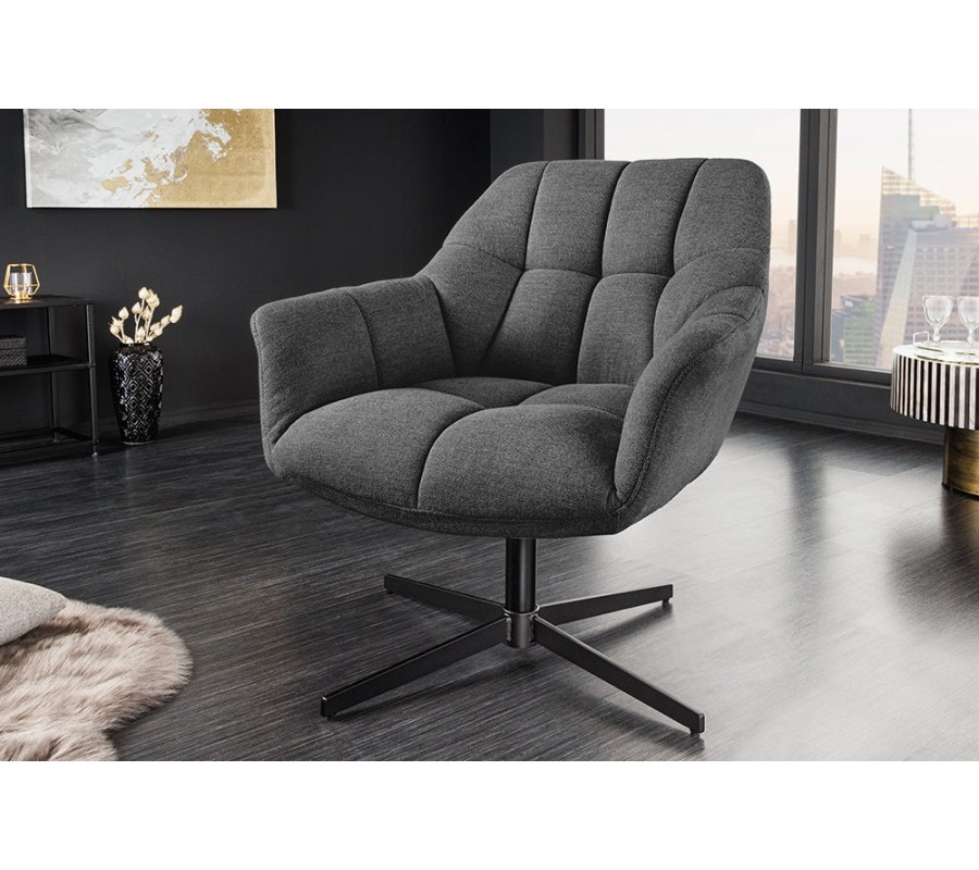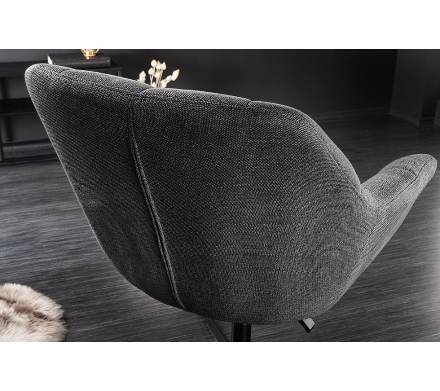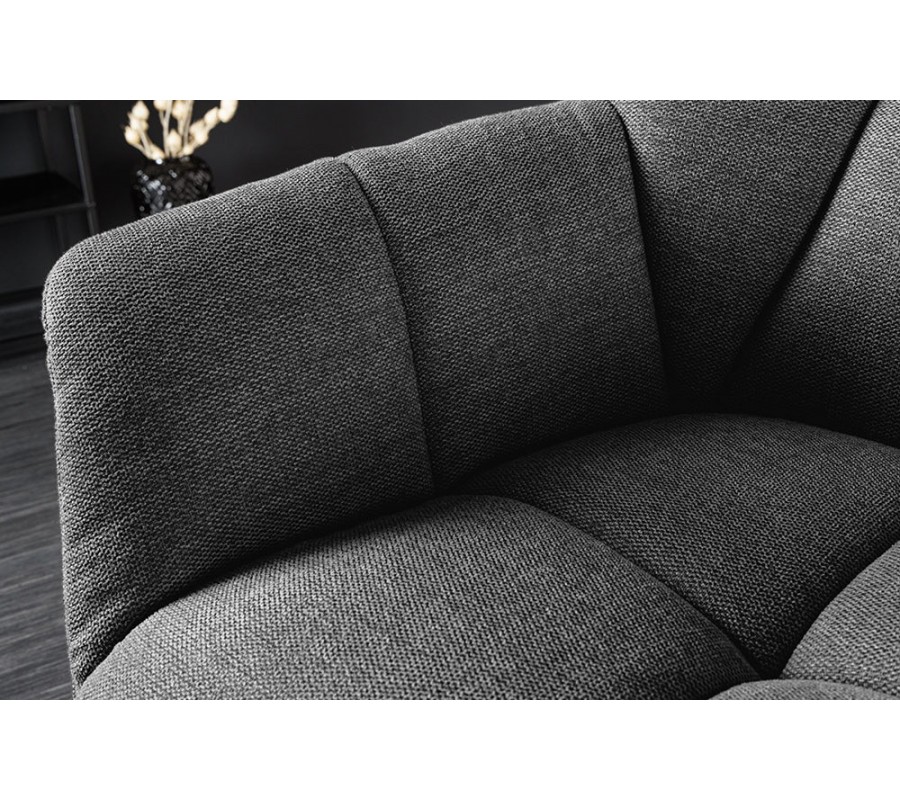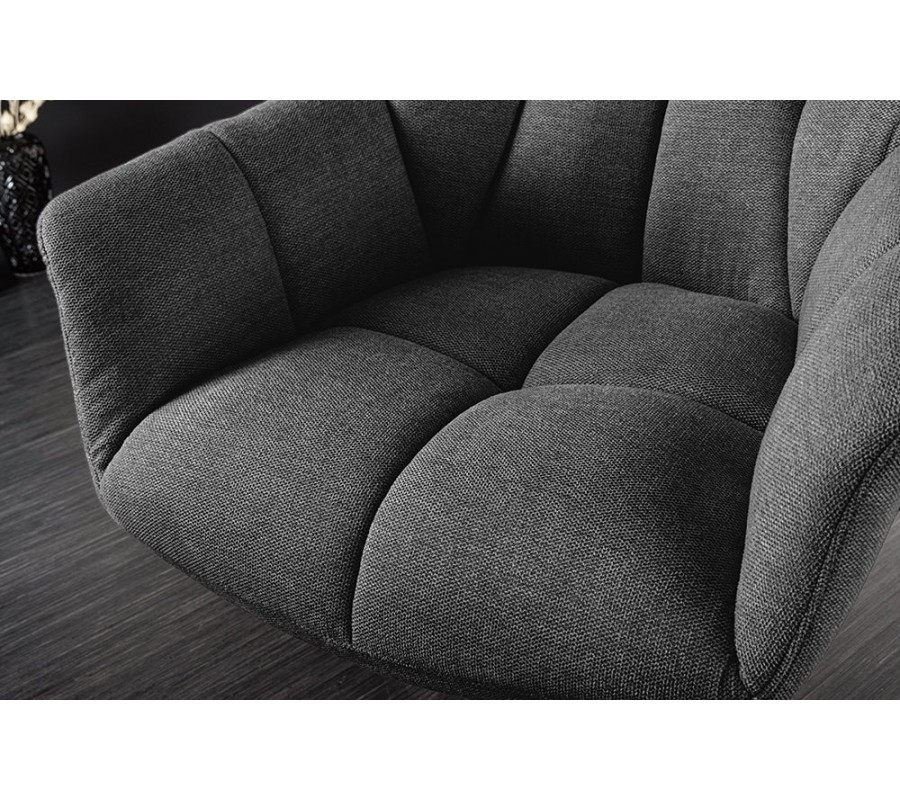 Křeslo má mohutnou sedací část s obdélníkovým sedadlem, které je v zadní části mírně zúžené. Doplňuje jej vysoká zádová opěrka, plynule přecházející do nižších bočních opěrek. Bohaté pěnové čalounění zaručí maximální komfort a prošívání se vzorem čtverců ještě zdůrazňuje jeho měkký vizuál. Potah je vyroben z mikrovlákna s designem hladce tkané textilie. Je mimořádně odolný a zároveň příjemný na dotek. Jeho šedá barva působí sofistikovaný dojmem.