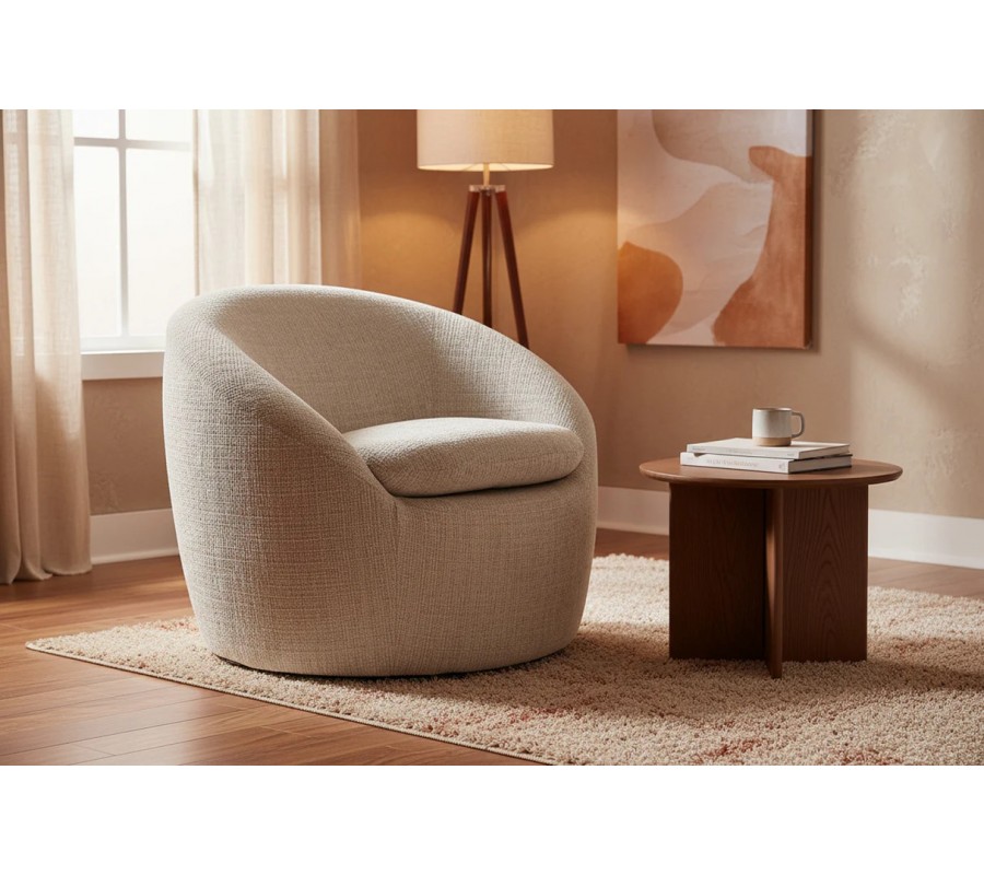 Křeslo Elian vynikne jako tvarově kontrastní prvek v moderním obýváku u lineární sedačky. Světlá béžová barva se krásně propojí s konferenčním stolkem z masivního dřeva či s doplňky z přírodního vlákna. Můžete jej také zkombinovat s příručním stolkem ze skla nebo s elegantními pastelovými akcenty v podobě polštáře či koberce.