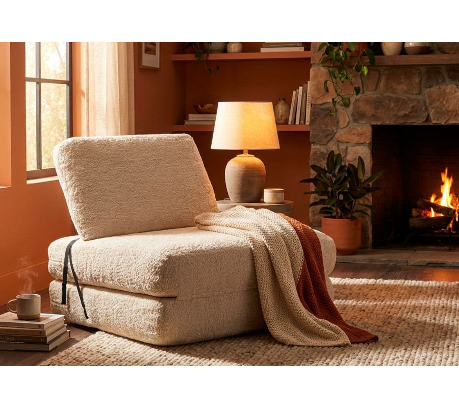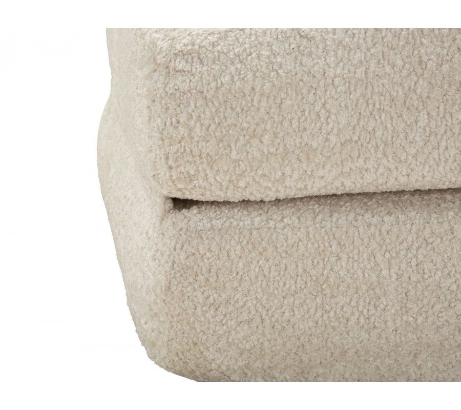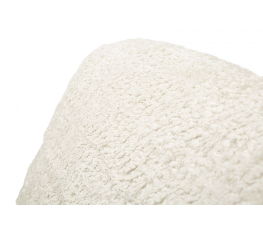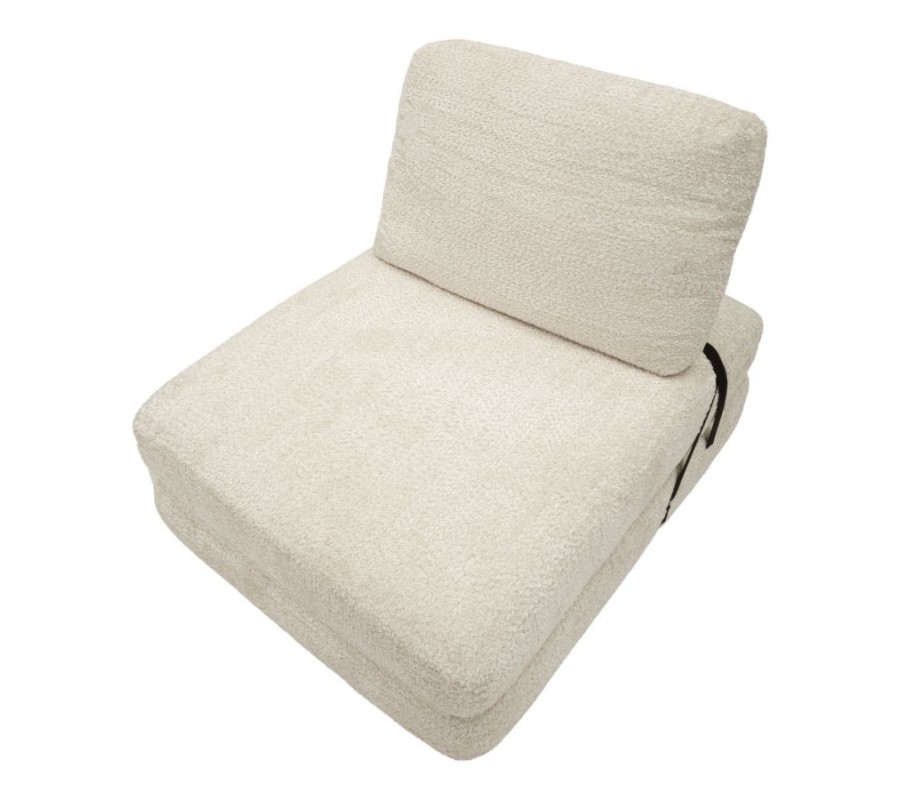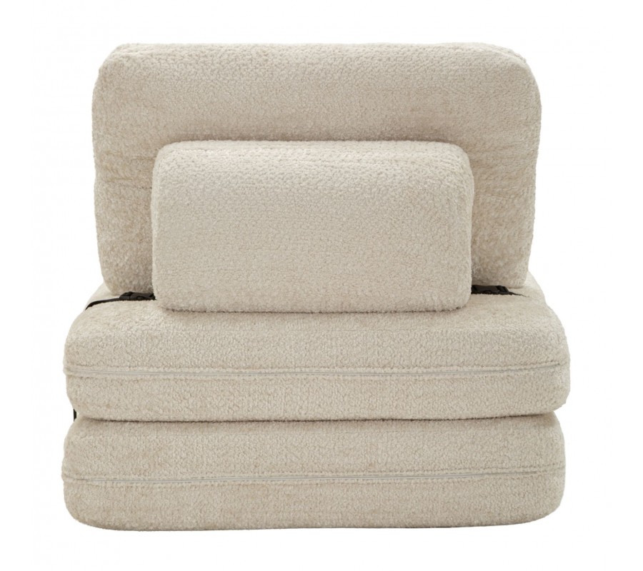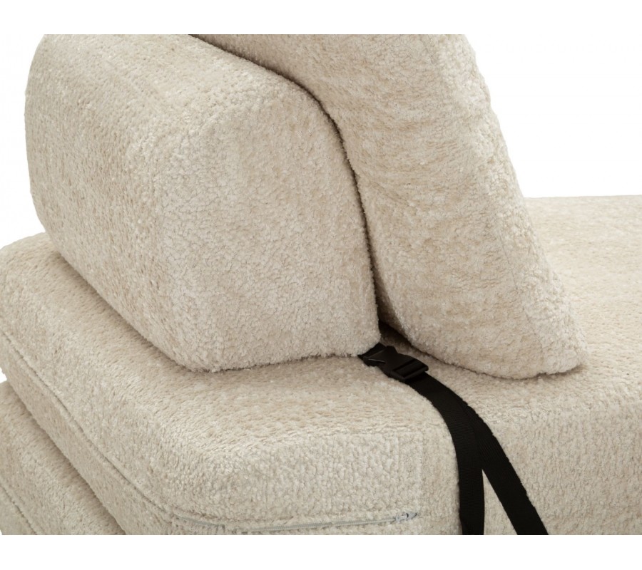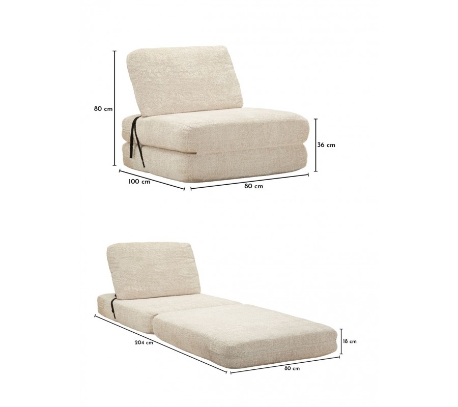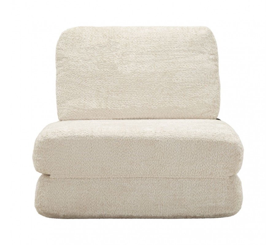 Moderní designové rozkládací křeslo Raffai v krémové barvě zaujme svým čistýmobdélníkovým tvarem a měkkým, objemným čalouněním s příjemnou texturou. Křeslo sestává z dvou podsedáků, přičemž spodní sedátko lze jednoduše překlopit dopředu a rozšířit tak plochu k sezení nebo ležení. Odélníkové opěradlo je zezadu podepřeno čalouněnou válcovou opěrou, která zvyšuje komfort i stabilitu. Praktickým a zároveň vizuálním detailem je černá šňůra na zadní straně, která zpevňuje obě sedací části a zabraňuje jejich samovolnému rozcházení při sezení, přičemž vytváří jemný kontrast ke světlému potahu.