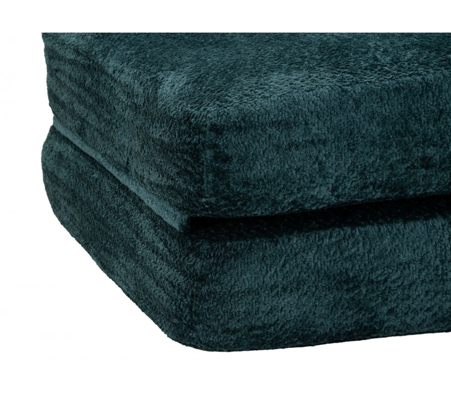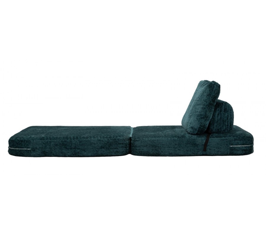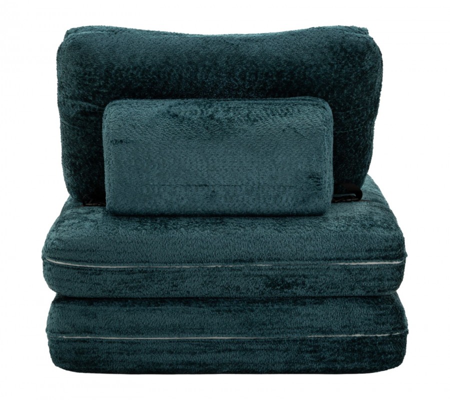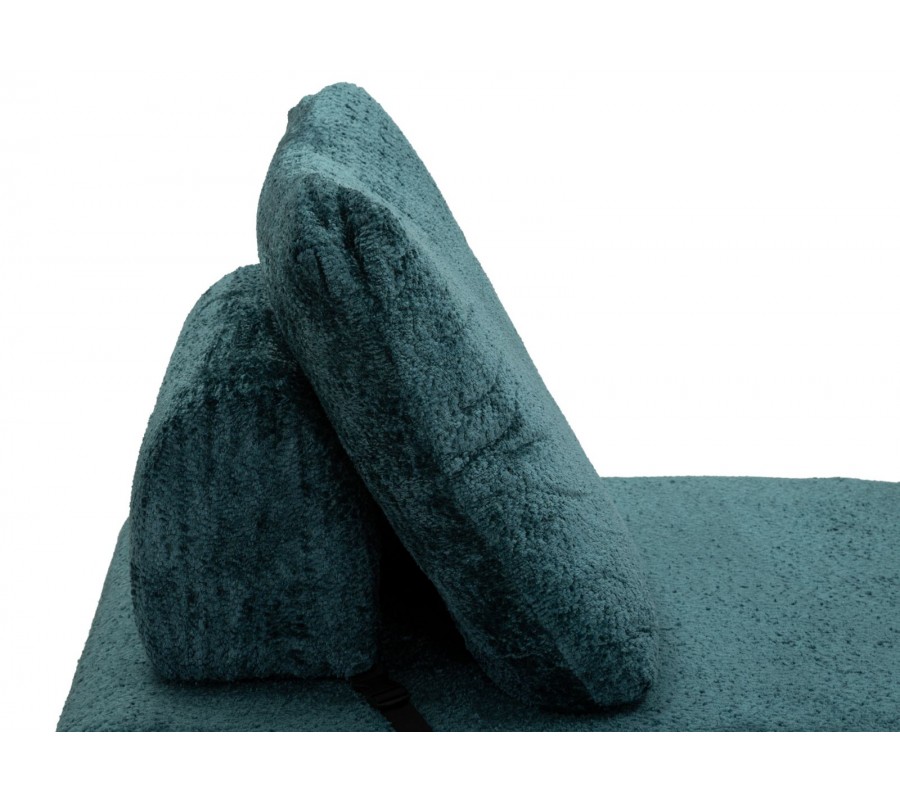 Moderní designové rozkládací křeslo v sytém modrém odstínu zaujme svým čistým obdélníkovým tvarem a měkkým, plyšovým potahem, který působí mimořádně útulně a komfortně. Křeslo je tvořeno dvěma podsedák lze jednoduše překlopit dopředu a zvětšit tak sedací nebo relaxační plochu. Obdélníkové opěradlo je zezadu podepřeno čalouněnou válcovou opěrou, která zvyšuje pohodlí a stabilitu při sezení. Obě sedací části jsou na zadní straně zpevněny černou šňůrou, která zabraňuje jejich rozcházení, zároveň však vytváří jemný grafický kontrast a designový detail. Křeslo je bez bočních opěrek, díky čemuž působí vzdušně, moderně a neuzavírá prostor.