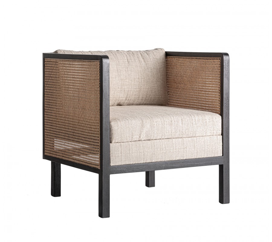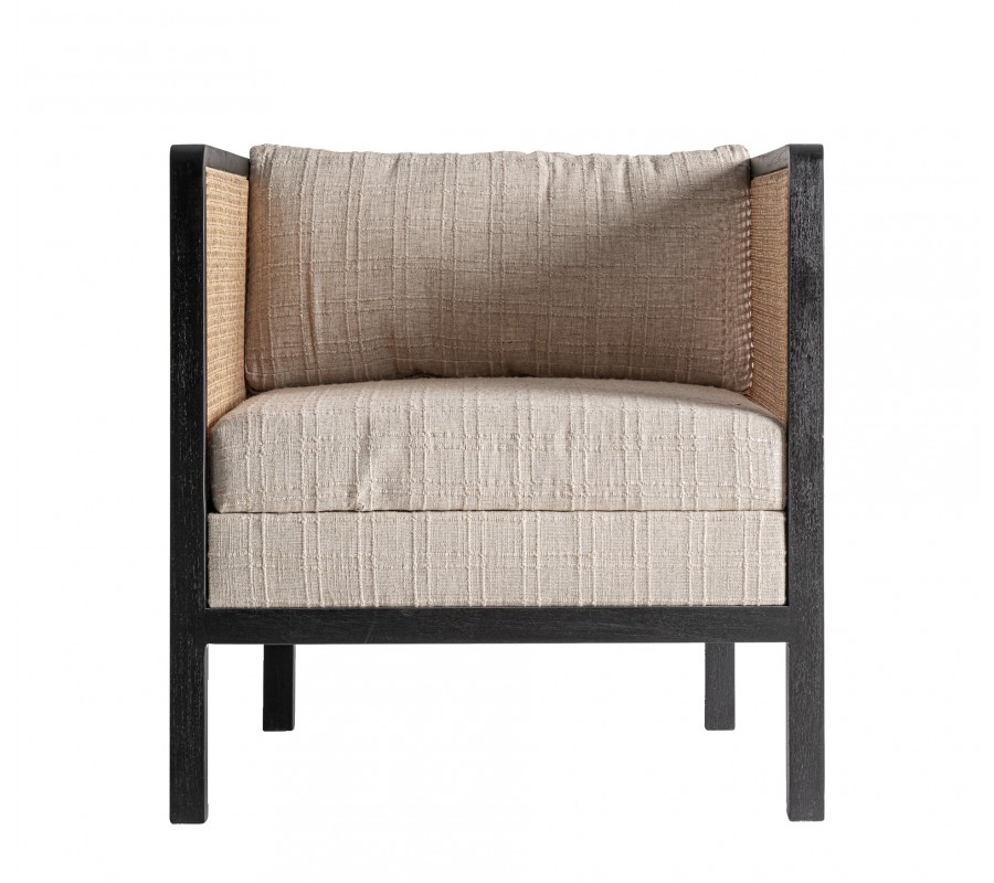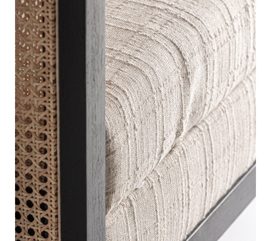 Boční panely a záď jsou vyplněny ratanovým výpletem s pravidelnou strukturou, která přináší do prostoru vzdušnost a přirozenou texturu. Tkaný vzor v kombinaci s tmavým dřevěným rámem vytváří sofistikovanou hru světla a stínu, zatímco měkký sedák a opěrný polštář v krémové látce dodávají křeslu komfort a vizuální zjemnění. silueta a precizní proporce odkazují na art deco estetiku v moderním provedení.