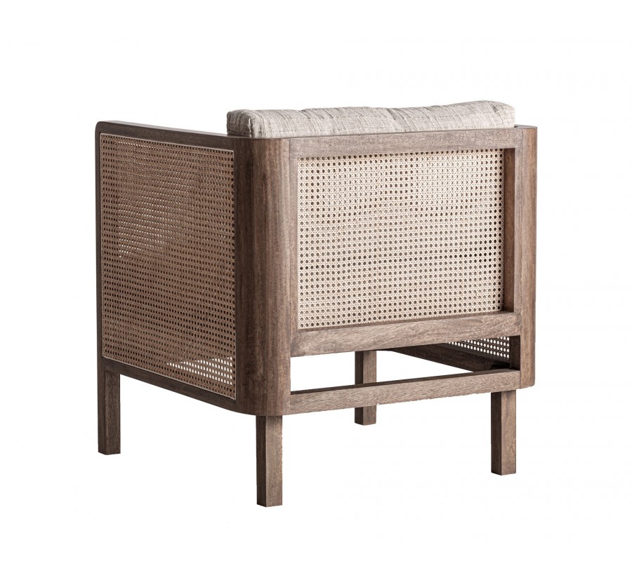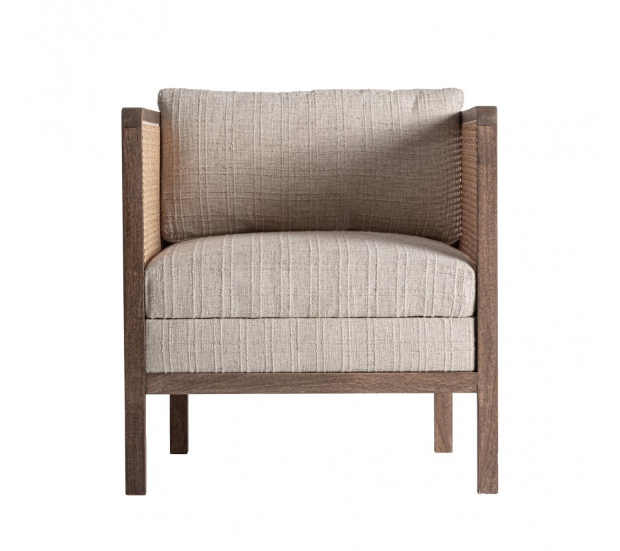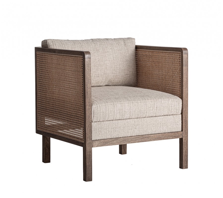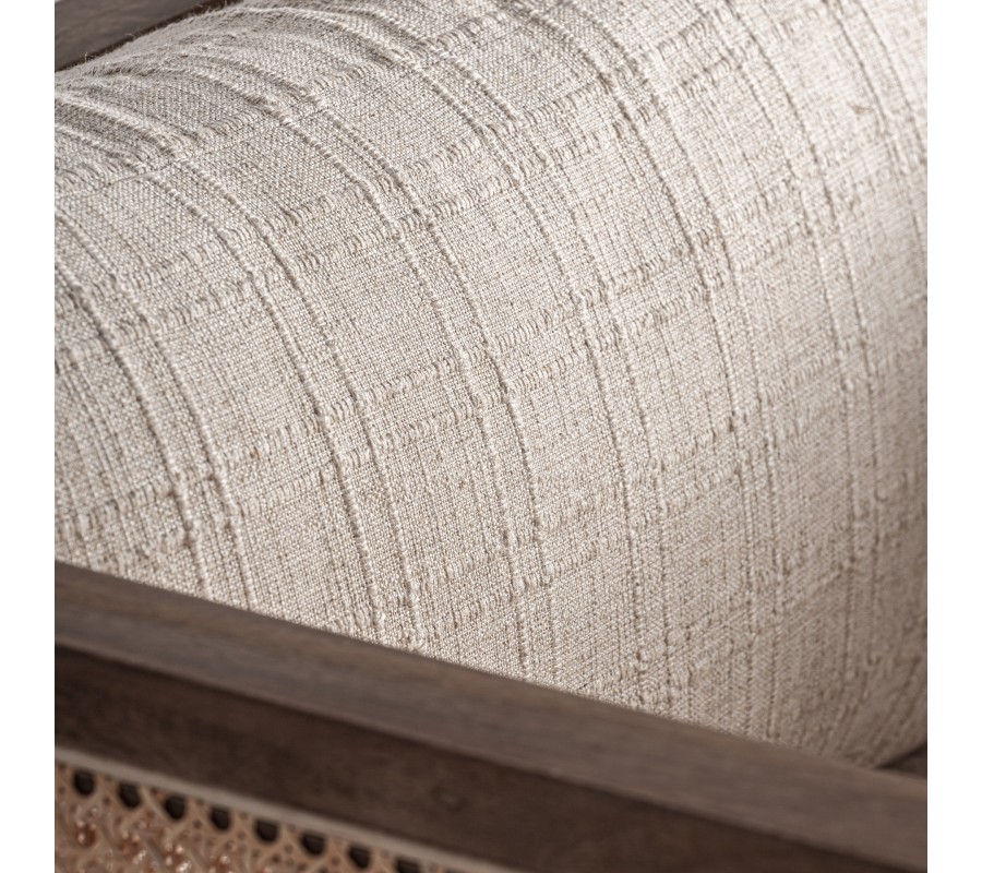 Luxusní art deco ratanové vyplétané křeslo Jufam z mangového hnědého dřeva se strukturovaným textilním béžovým potahem 77 cm