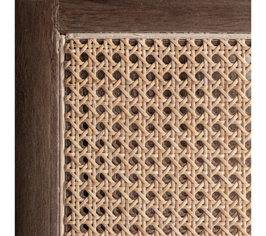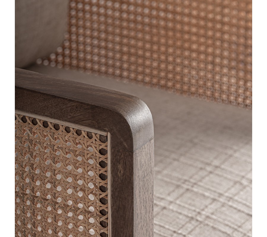 Art deco ratanové čalouněné křeslo Jufam vyniká harmonickým spojením přírodních materiálů a nadčasového designu. Konstrukce ze světle hnědého mangového dřeva působí teplo a autenticky, přičemž jemná kresba dřeva zvýrazňuje přirozený charakter materiálu. Boční panely a zadní část jsou vyplněny ratanovým výpletem v klasickém vídeňském vzoru, který dodává křeslu vzdušnost a vizuální lehkost.