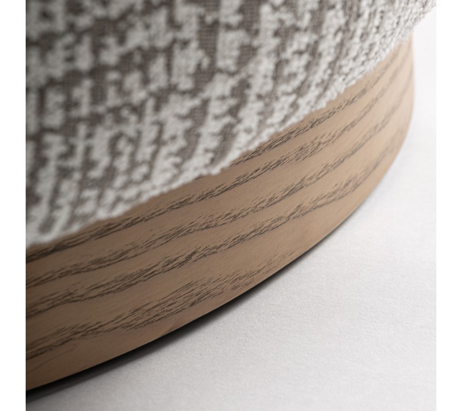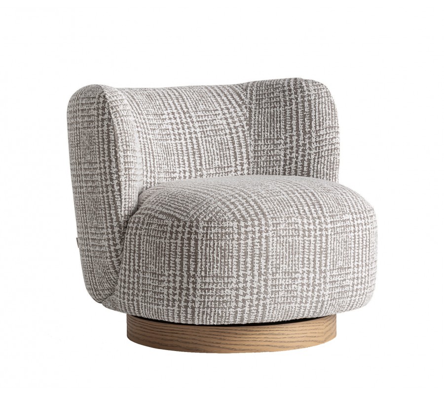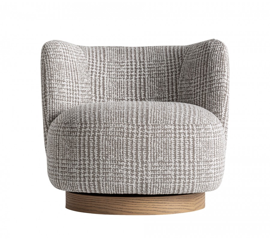Čalounění tvoří melírovaná látka z mikrovlákna v šedobéžových tónech s jemným geometrickým vzorem, která působí elegantně a zároveň útulně. Křeslo je osazeno na okrouhlé otočné podstavě ze světle hnědého dřeva, jejíž přirozená kresba letokruhů dodává nábytku teplo a přirozený charakter.