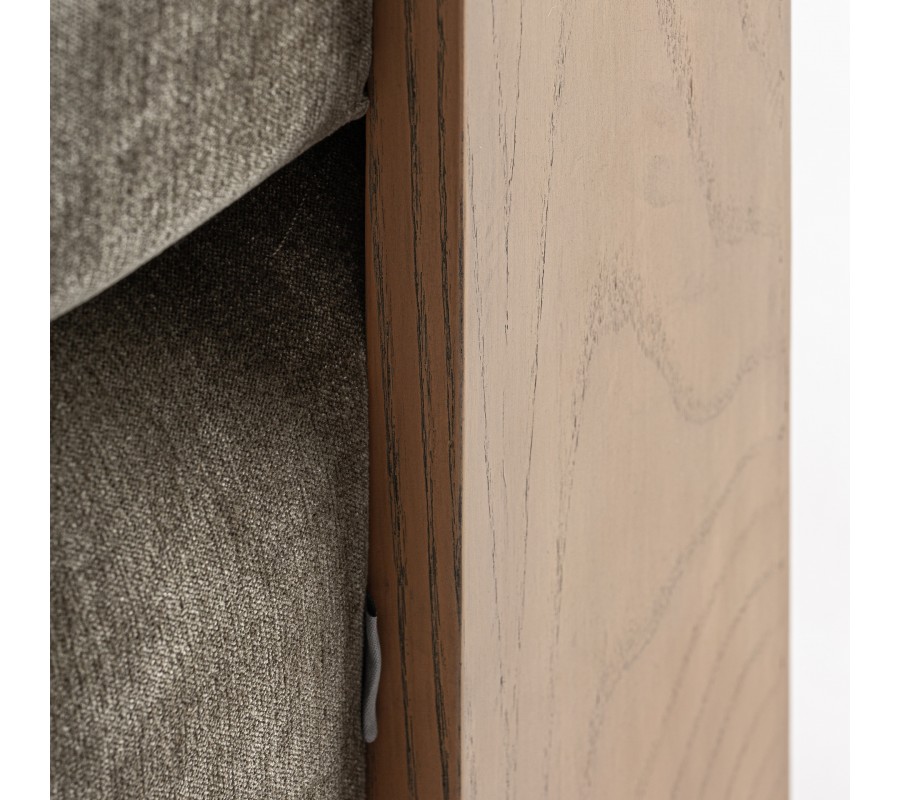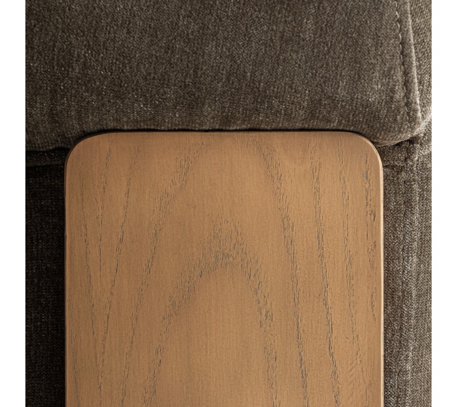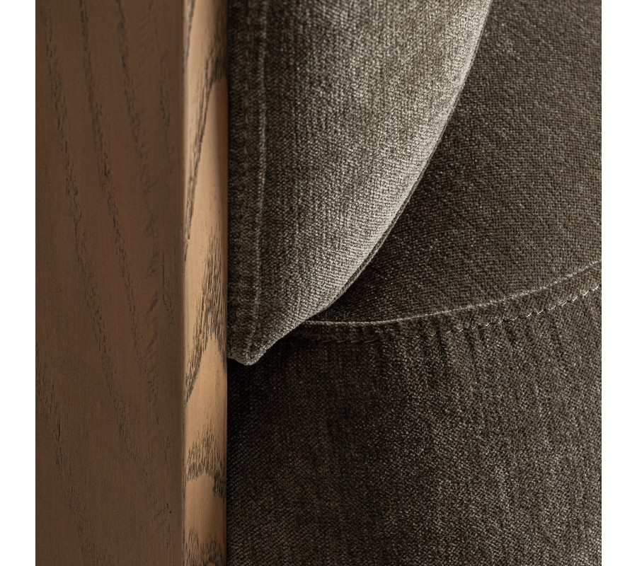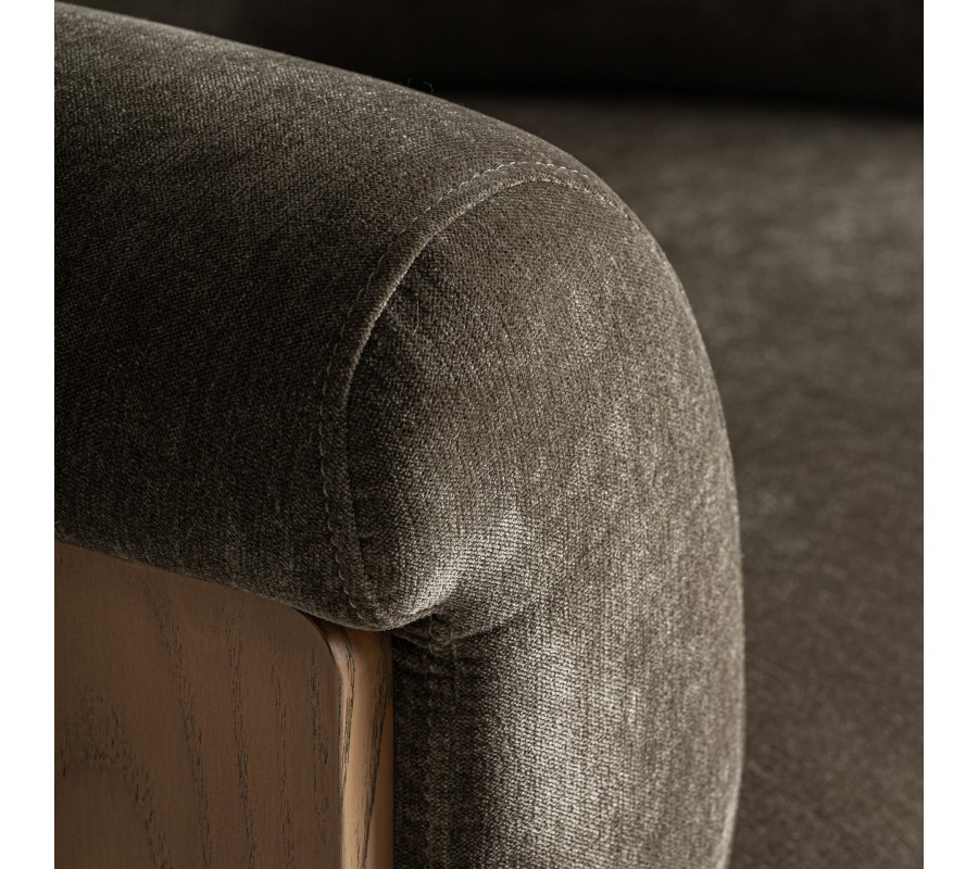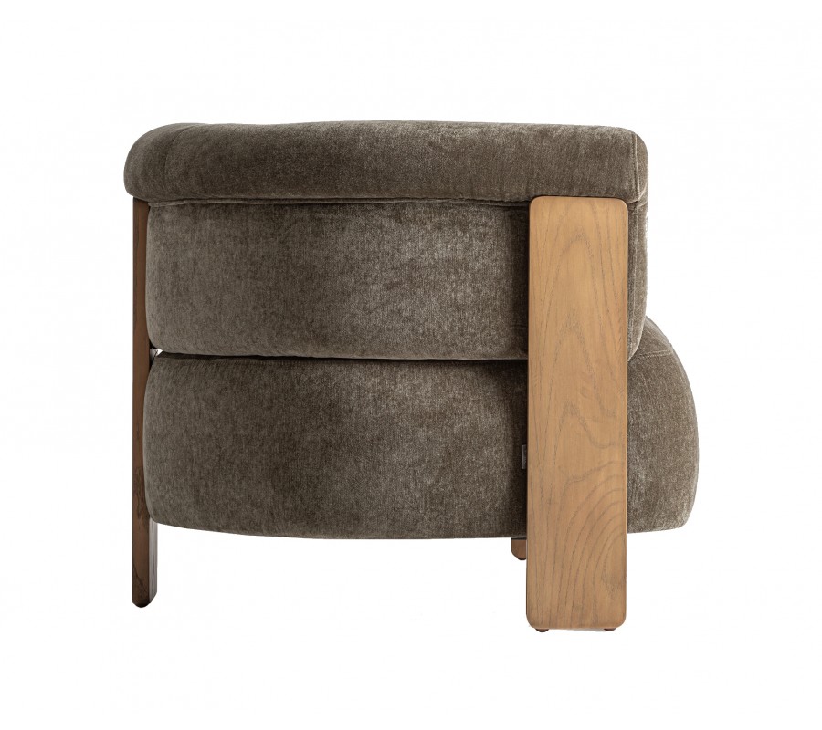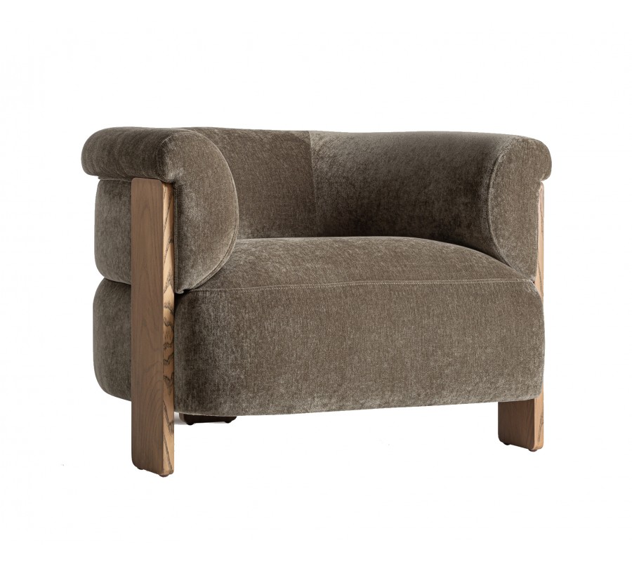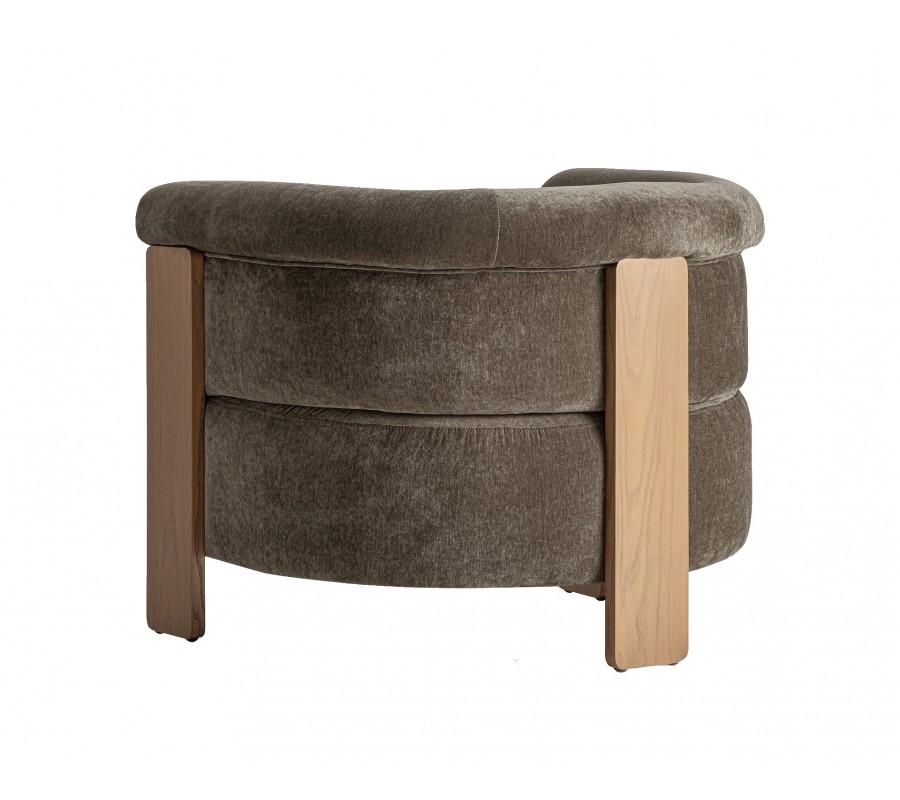 Zajímavým detailem je i zadní strana opěradla, která je tvořena dvěma měkce čalouněnými horizontálními segmenty. Tento prvek zvýrazňuje objem křesla a dodává mu výrazný plastický charakter. Stabilitu zajišťují tři ploché dřevěné nohy s přirozenou kresbou dřeva, které vytvářejí příjemný kontrast s měkkým čalouněním.