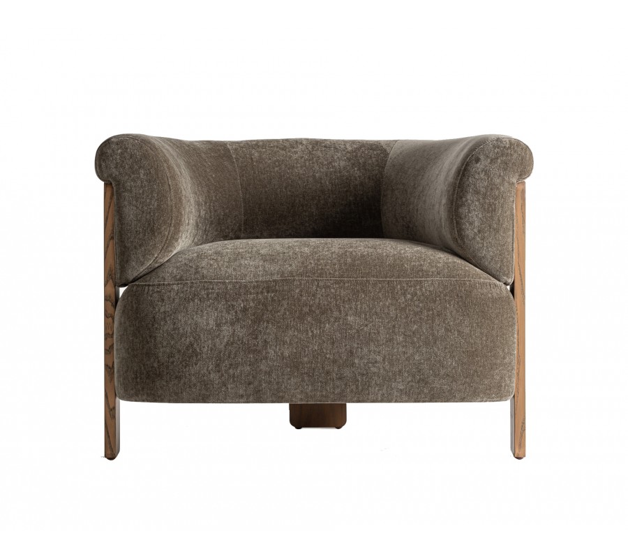 Křeslo má kompaktní, architektonicky tvarovaný profil, kde jsou boční opěrky plynule propojeny s opěradlem zad. Tento oblý rám vytváří příjemně obepínající tvar, který podporuje pohodlné sezení. Hrubé čalouněné sedátko dodává křeslu výrazný objem a komfort.