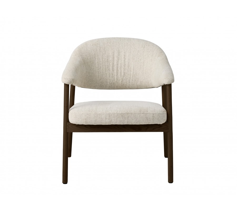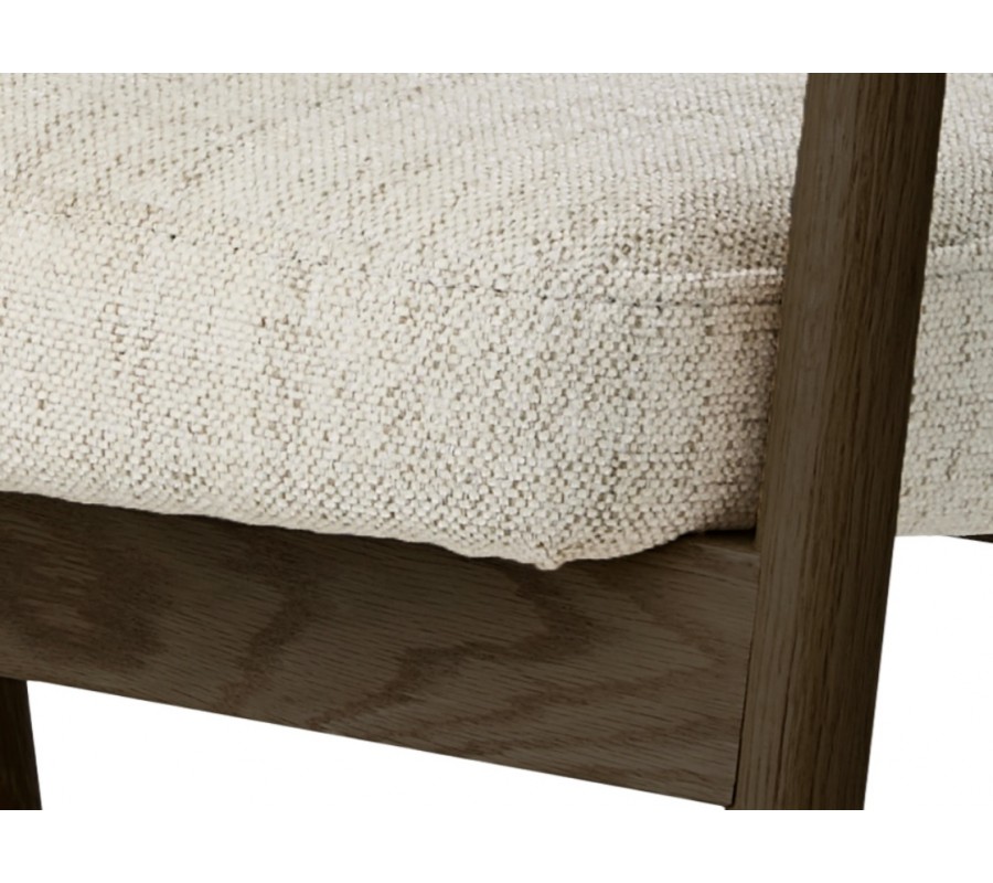 Konstrukce je vyrobena ze dřeva v tmavém hnědém dubovém provedení, které dodává křeslu typický severský vizuál. Viditelná kresba letokruhů podtrhuje přírodní charakter materiálu. Rám elegantně doplňuje potah v krémově bílé barvě s jemným melírováním. Ženilková povrchová úprava je příjemně měkká a vytváří útulný dojem, přičemž mikrovlákno zajišťuje textilii odolnost a snadnou údržbu při každodenním používání.