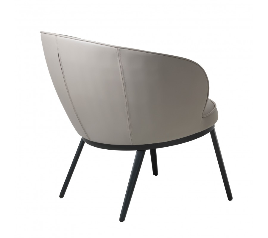 Dominantou křesla je robustní sedací část s plynulými, zaoblenými liniemi. Sedadlo má kulatý tvar, na který přirozeně navazuje zádová opěrka. Její horní hrana je obloukovitá a směrem k bokům se snižuje. Na stranách jsou její rohy jemně vytaženy, což vytváří elegantní bočnice. Zakřivení opěrky se přizpůsobuje tělu a zvyšuje tak komfort při sezení.