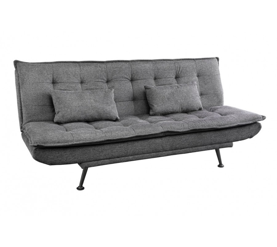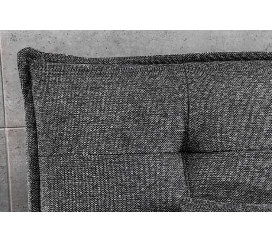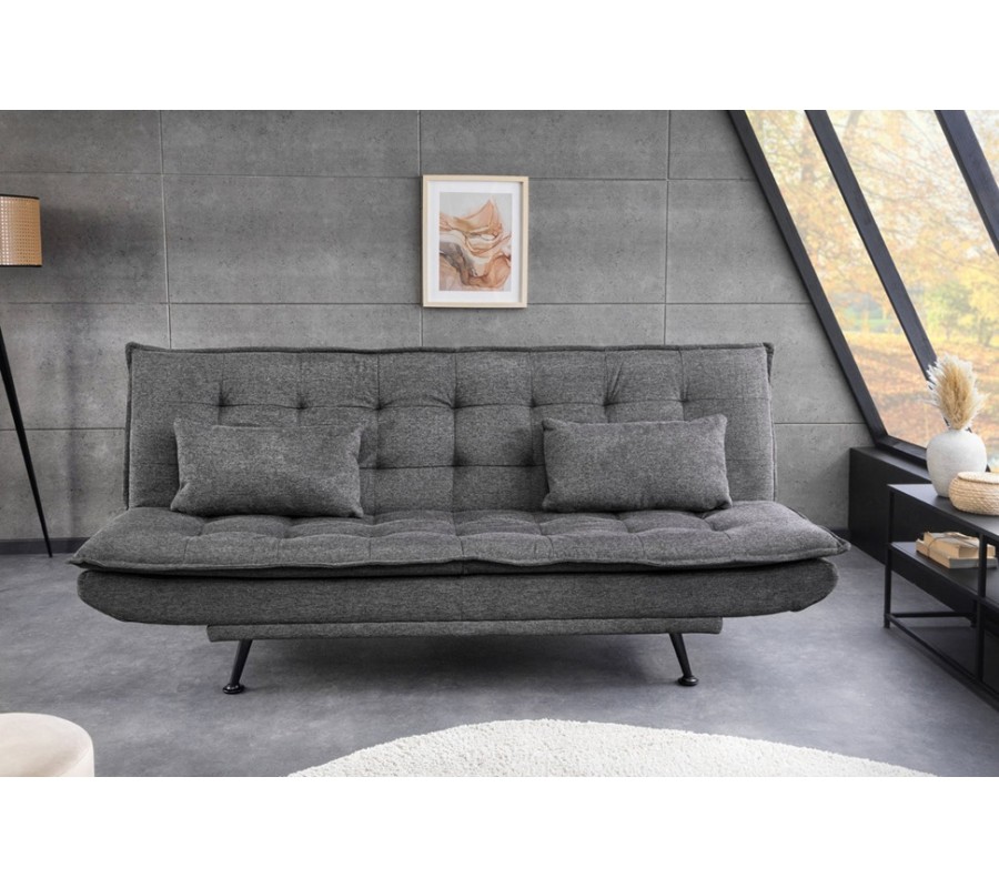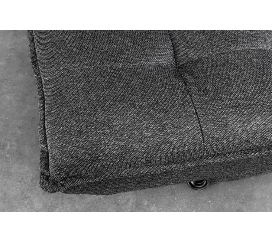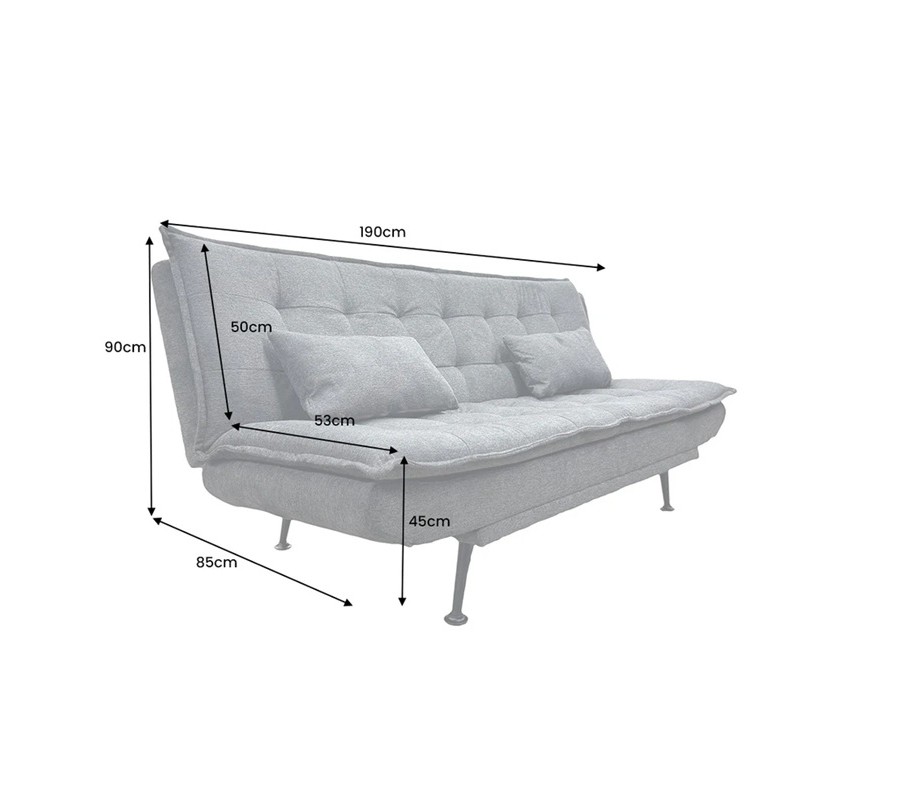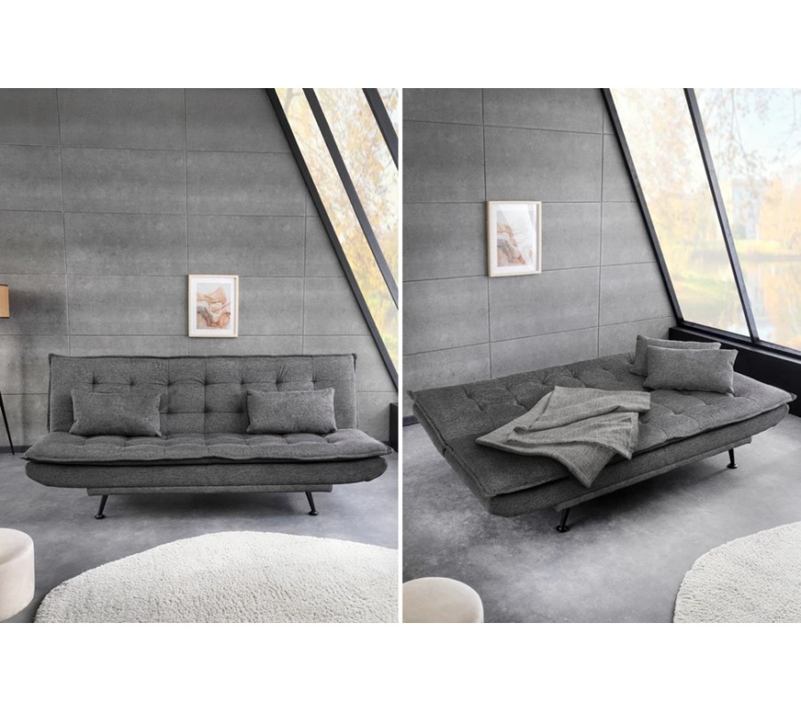 Díky rozkládací funkci lze sedačku jednoduše přeměnit na pohodlné lůžko vhodné pro příležitostné přespání nebo denní relax. Komfort zvyšují dva obdélníkové polštáře, které poskytují dodatečnou oporu zad a zároveň esteticky doplňují celkový design. Stabilitu zajišťuje pevná spodní konstrukce doplněná o čtyři jemně zkosené kovové nožičky v černé barvě, které vytvářejí kontrast k šedému čalounění a dodávají sedačce moderní akcent.