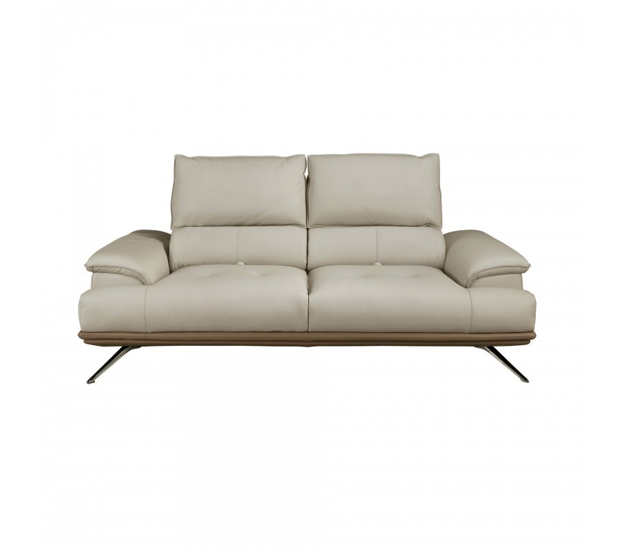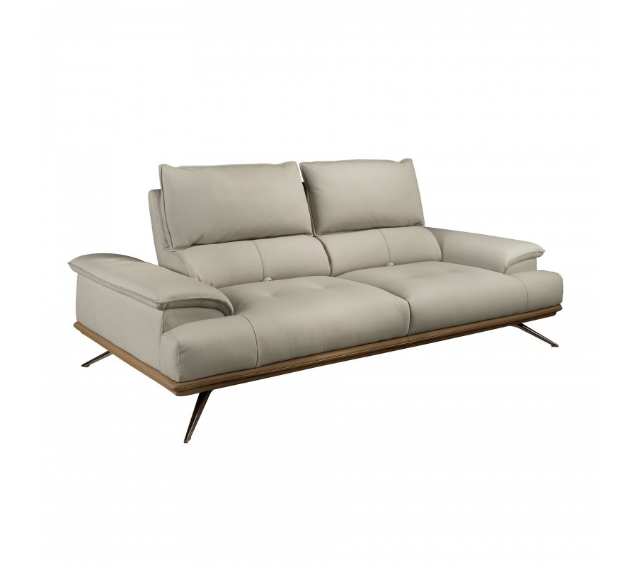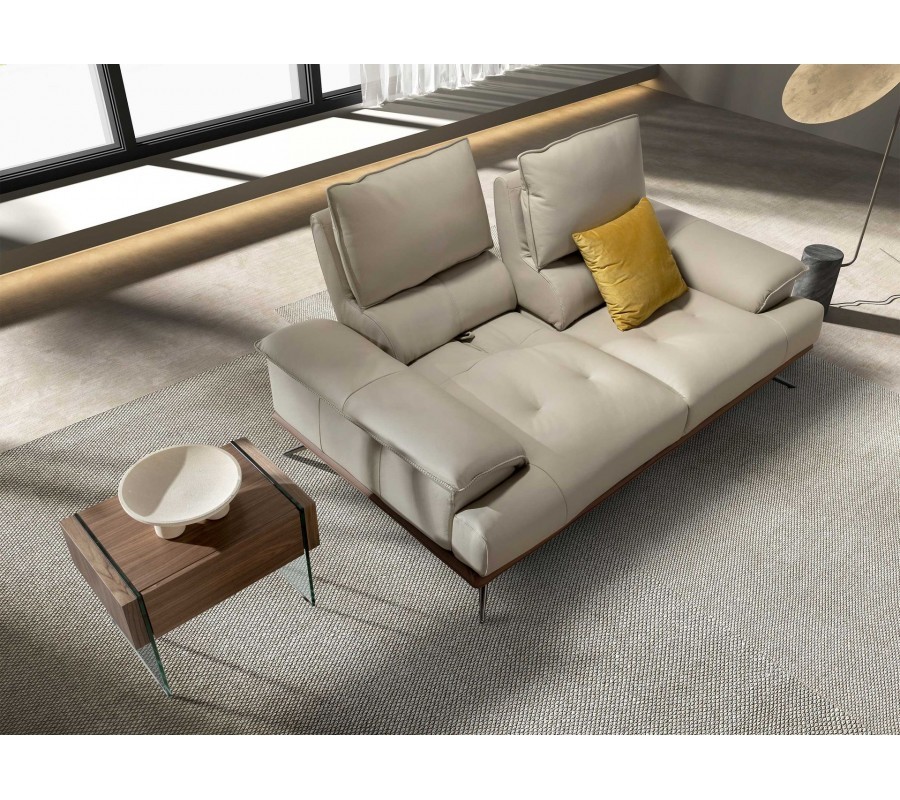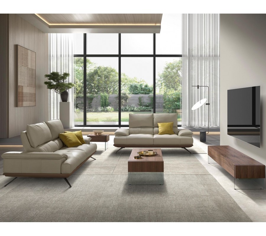 V centru sestavy se nacházejí sedačky s potahem z pravé kůže ve světlém šedém odstínu taupu. Poskytují sezení pro dvě a tři osoby a maximální komfort zaručí polohovatelná zádová opěrka. Detail ve spodní části z hnědé kůže krásně koresponduje s pravou ořechovou dýhou, ze které jsou vyrobeny stolky. Bohatá hnědá barva dřeva s přiznanou kresbou letokruhů přináší do prostoru pocit tepla a podtrhuje naturální vizuál sestavy.
