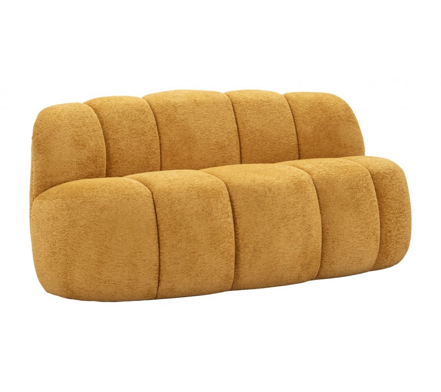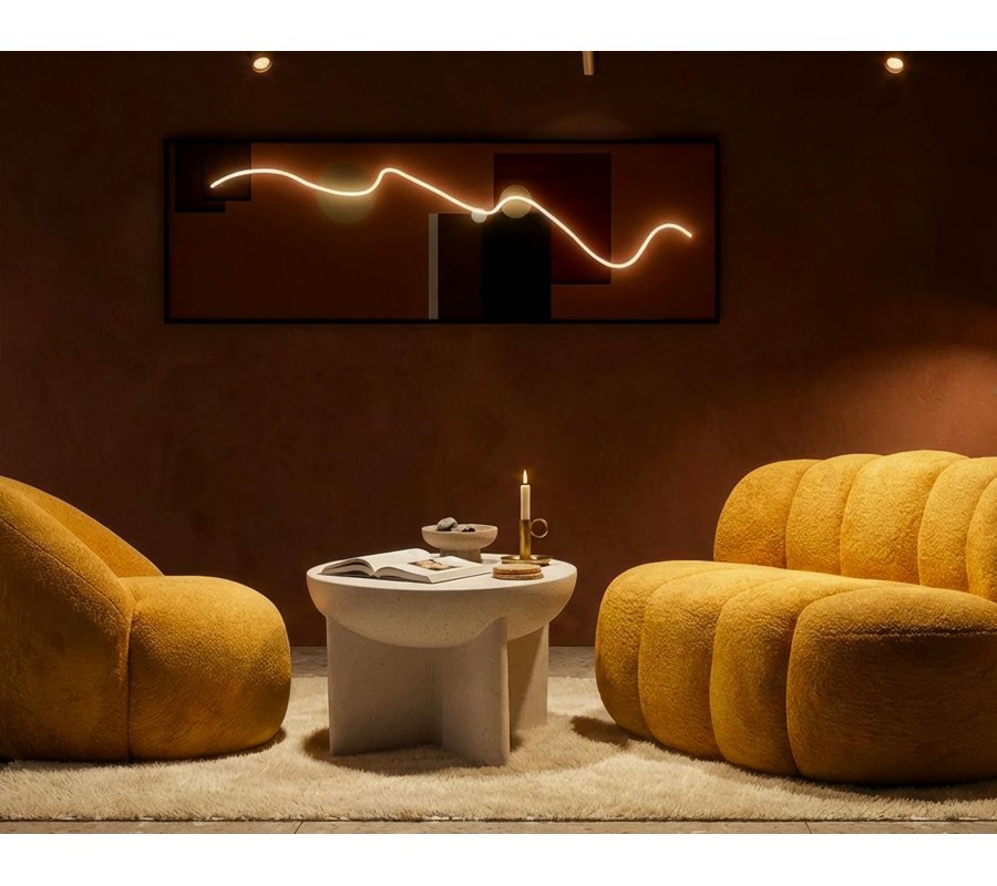 Plyšové provedení potahu kontrastuje s kamenným vizuálem stolků. Žlutá barva působí teplým a útulným dojmem, zatímco výrazné tvary a provedení stolků působí jako sochařské dílo a dodává kompozici funkční a zároveň dekorativní prvek.